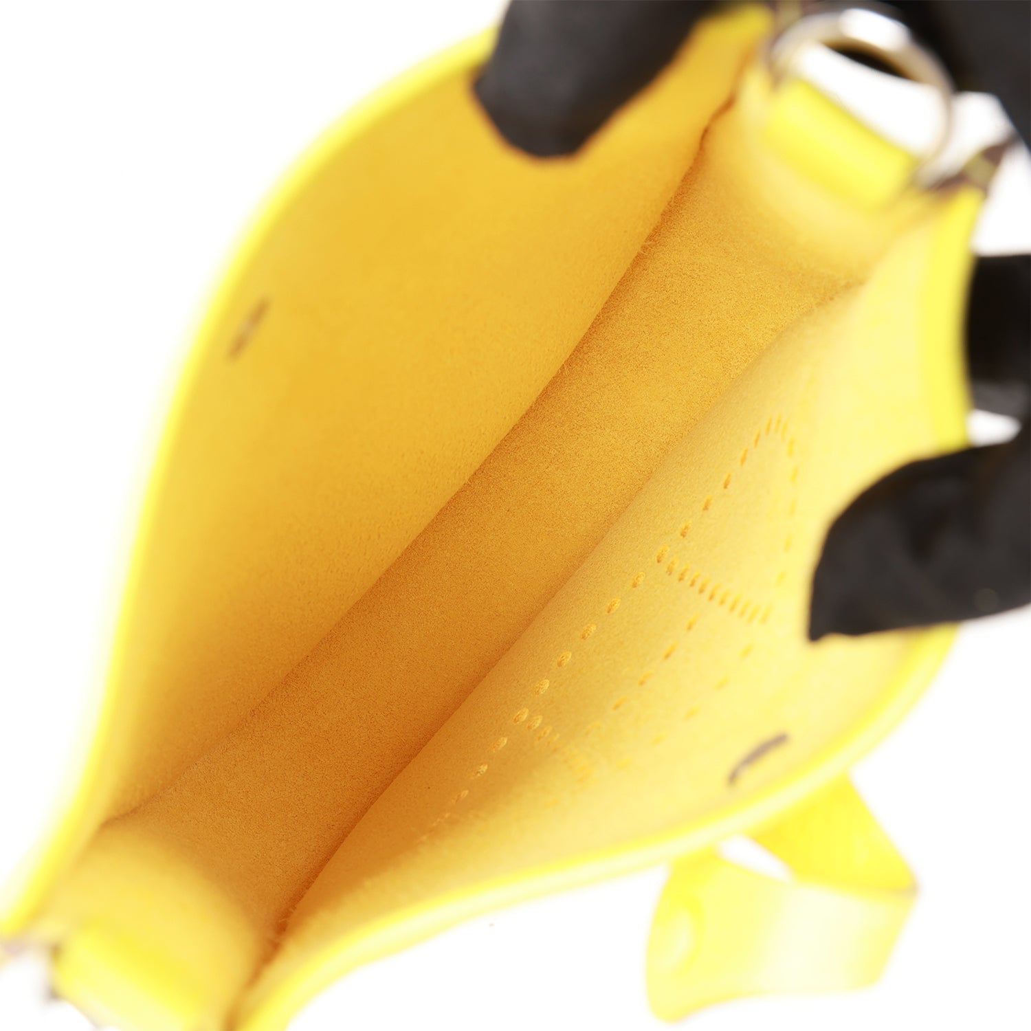 This Evelyne TPM is in Lime clemence leather with palladium hardware and features tonal stitching stitching, pull tab top closure and a quadrille removable canvas and leather shoulder/crossbody strap.