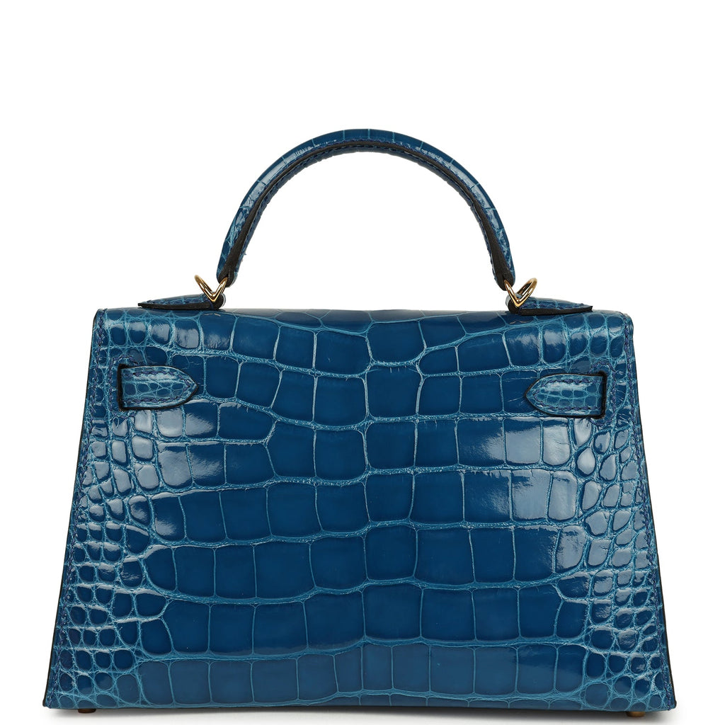 This Kelly, in the Kelly, in the Sellier style, is in Bleu Mykonos Shiny Alligator Mississippiensis leather with gold hardware and has tonal stitching, two straps with front toggle closure, single rolled handle and removable shoulder strap.