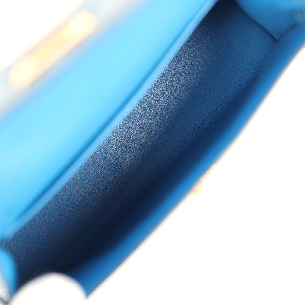 The interior is lined with Bleu Mykonos lambskin leather and has one open pocket on the back wall.