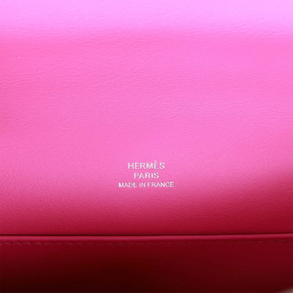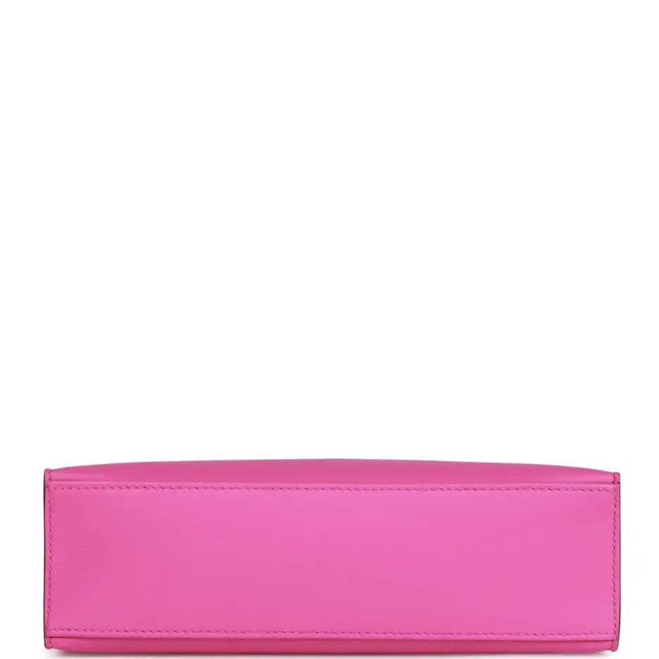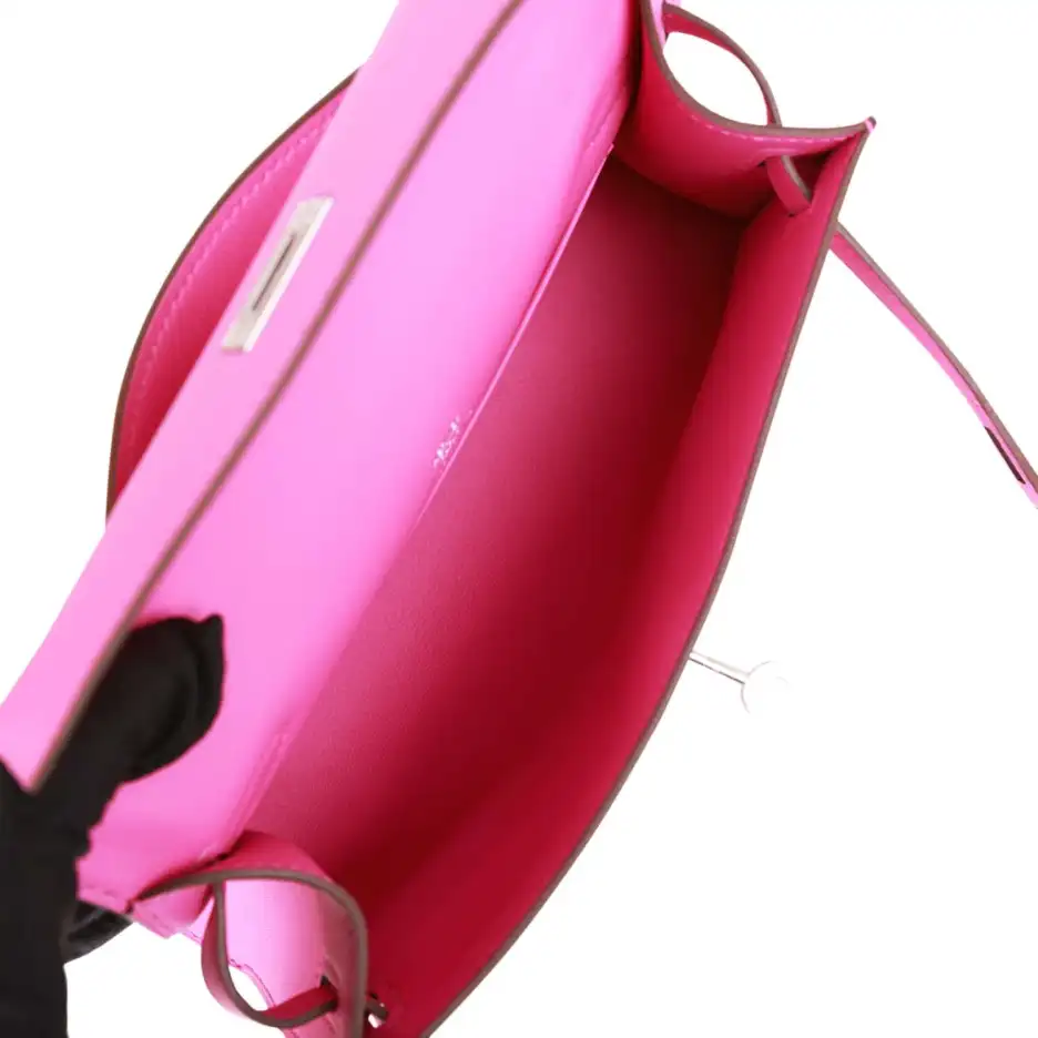 This Mini Kelly Pochette is in Magnolia swift leather with palladium hardware and has tonal stitching, front flap, two straps with center toggle closure and a top flat handle.