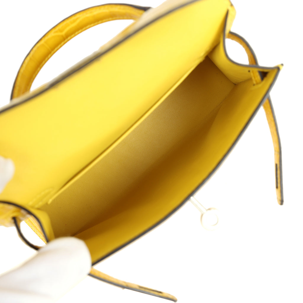 This Kelly, in the Sellier style, is in Mimosa Shiny Alligator Mississipiensis leather with palladium hardware, has tonal stitching, two straps with front toggle closure, a single rolled handle, and a removable shoulder strap.