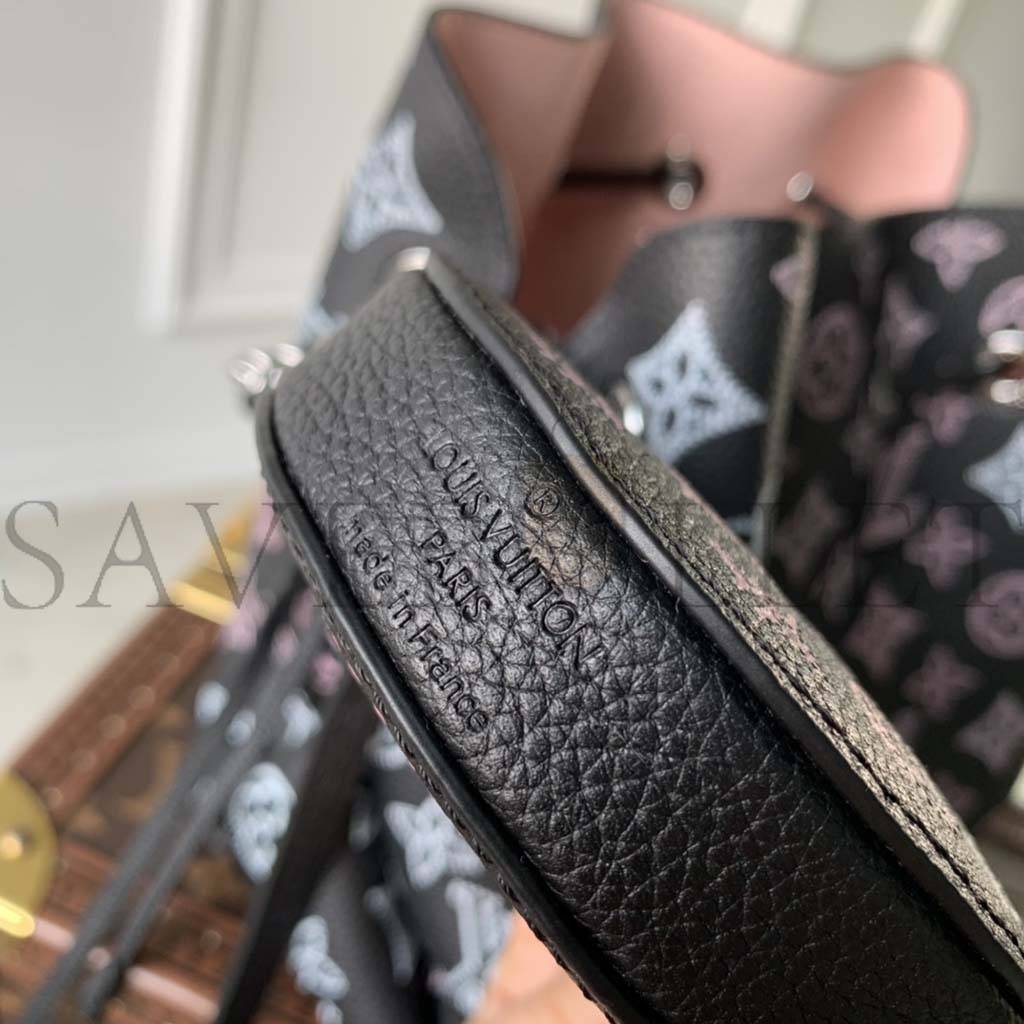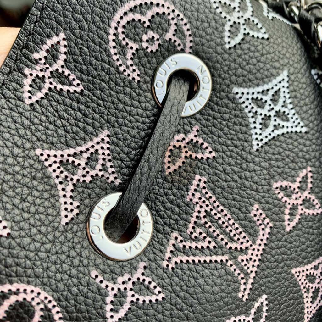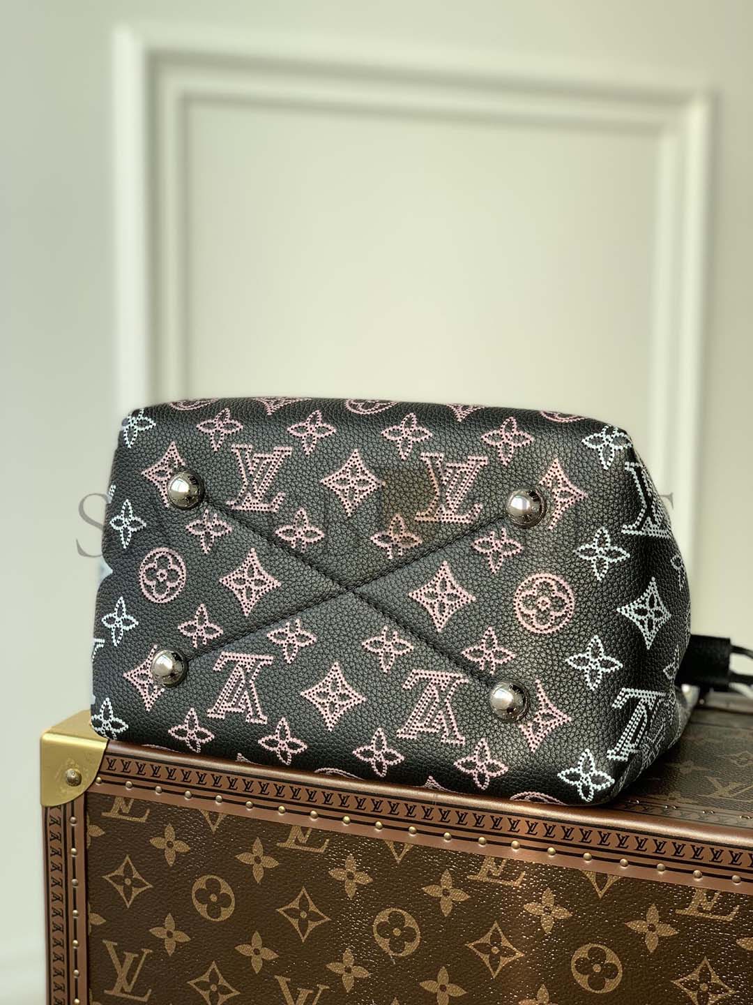 The Bella bucket bag, and its attached round coin purse, are made from Mahina calf leather with a perforated Monogram pattern. Gradient pinks and creams accentuate the motif while bringing a touch of color. Tone-on-tone leather trim completes the design. Inside the bag features a pale pink lining.