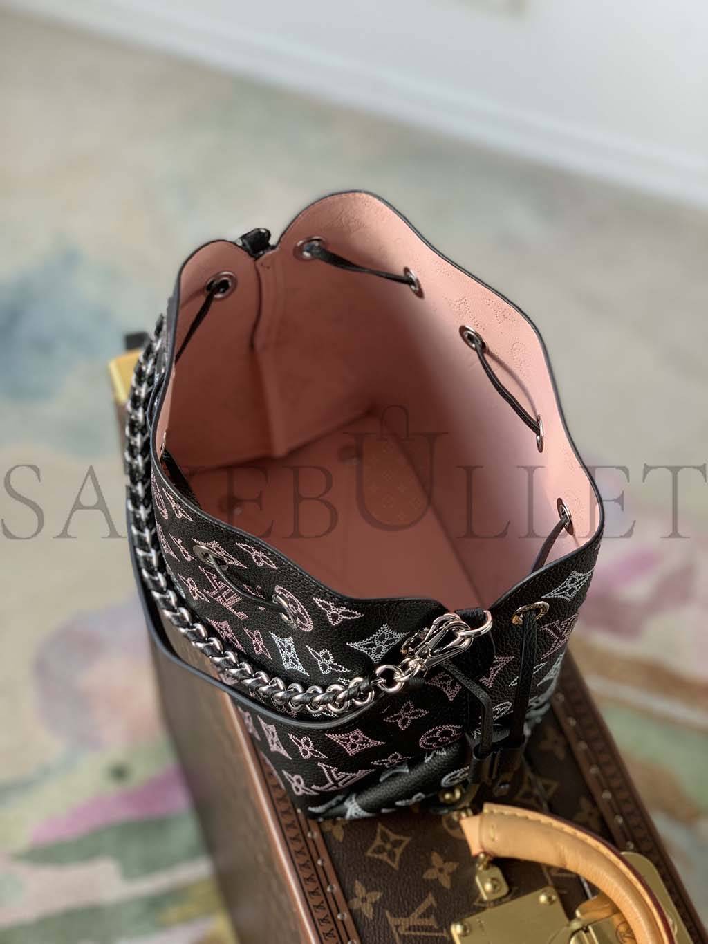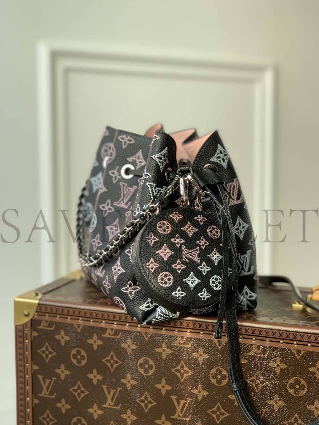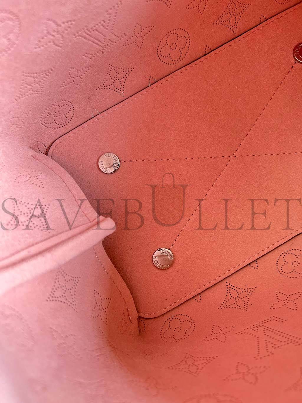 The Bella bucket bag, and its attached round coin purse, are made from Mahina calf leather with a perforated Monogram pattern. Gradient pinks and creams accentuate the motif while bringing a touch of color. Tone-on-tone leather trim completes the design. Inside the bag features a pale pink lining.