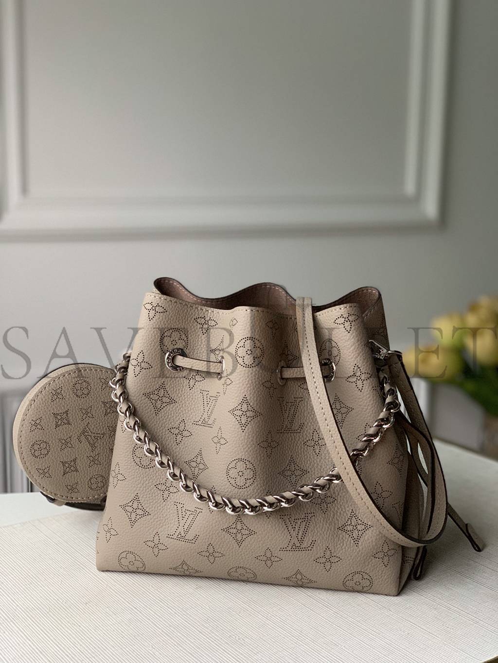 The Bella Tote is made from supple Mahina calf leather in a subtle and elegant Galet. The leather is delicately pleated and draped, and adorned with a jewel-like chain. The Bella Tote blends the design of the classic bucket bag with the carryall tote, making this stylish bag perfect for everyday use.
