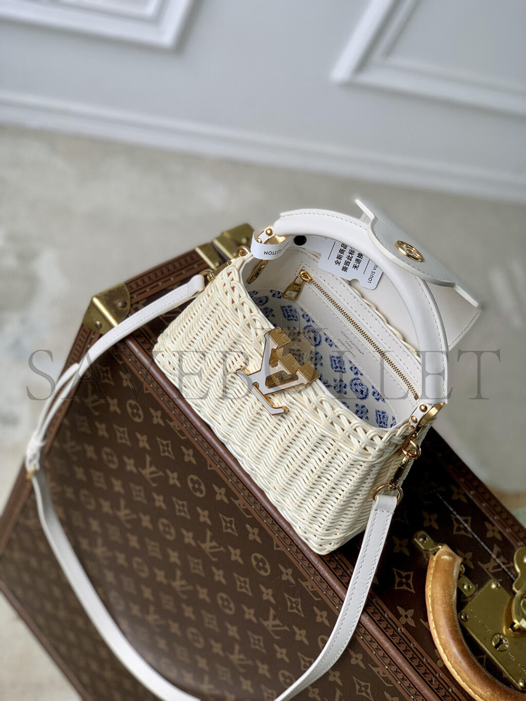 Fits: 6.1-inches smartphone, Capucines compact wallet, keys, lipstick