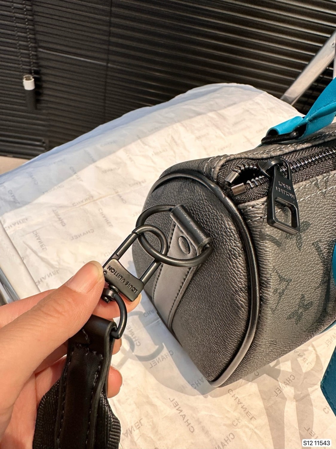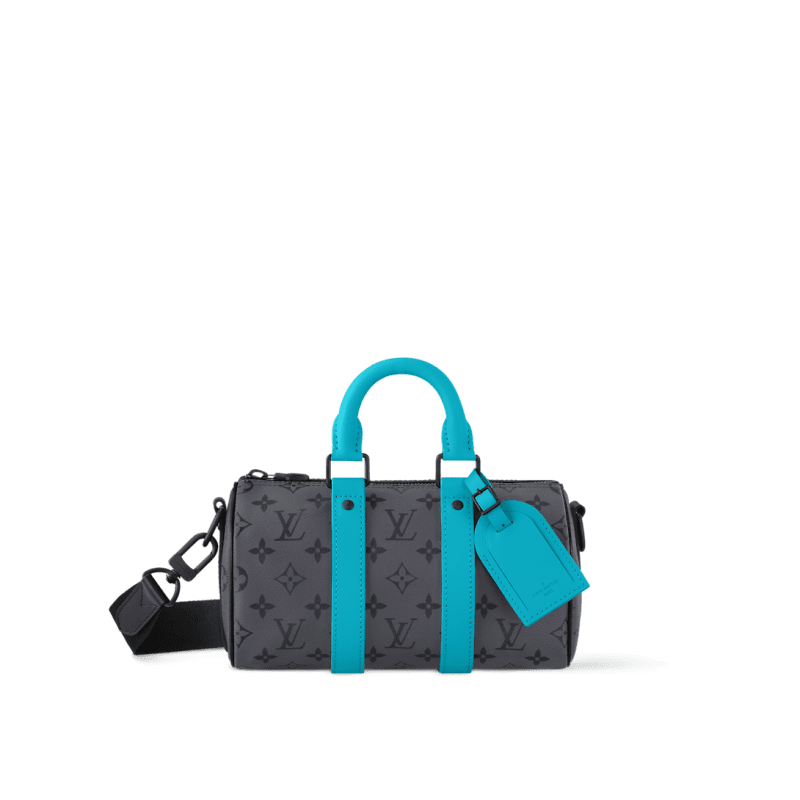 Monogram Eclipse Reverse canvas is paired with turquoise-color leather trim on this Keepall Bandoulière 25 city bag. The lateral reinforcement bands, top handles, and name tag all pop with vibrant color, giving an energetic feel to this compact bag. The matte-black hardware and black-color removable and adjustable textile strap complete the design.