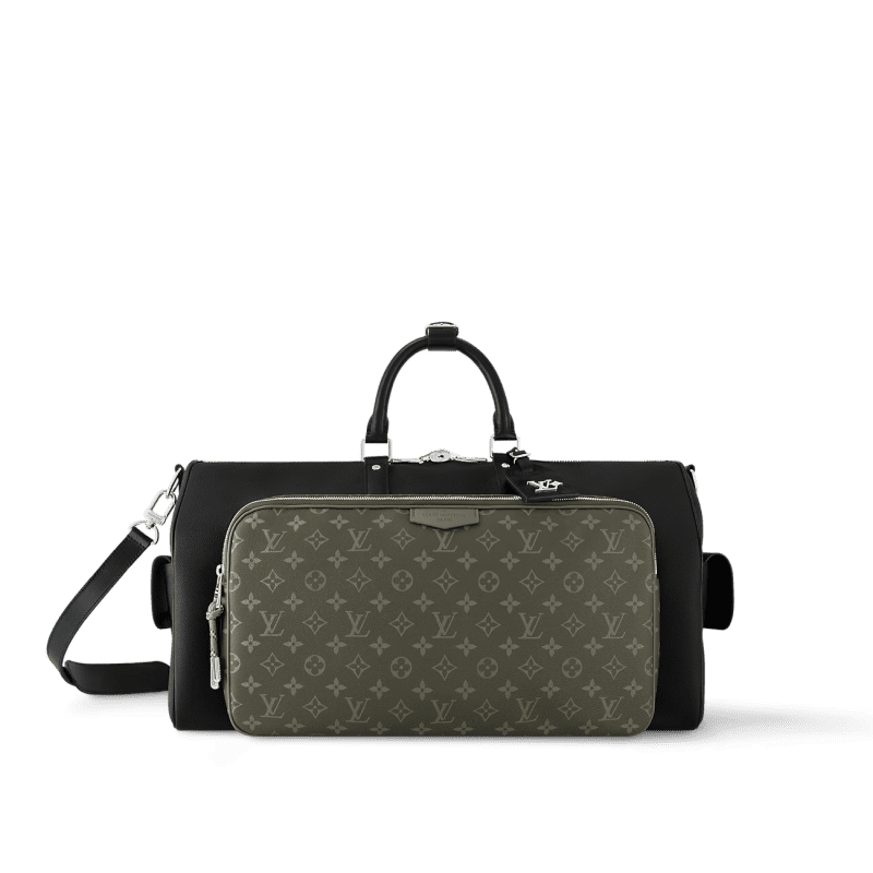 Part of the LV Park collection, the iconic silhouette of the Keepall Bandoulière 50 is reimagined with outside pockets that bring versatility. Made from Monogram coated canvas, the zipped side pocket perfectly complements the grained black leather of the bag, creating a patchwork feel. It features a removable LV Lovers name tag in suede.