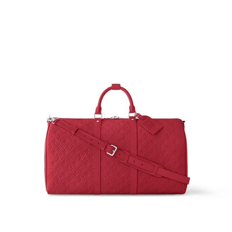 This Keepall Bandoulière 50 weekend bag is made from brightly colored Taurillon Monogram leather as part of the LV Colormania collection. The Monogram pattern embossed into the sturdy leather brings a feeling of understated sophistication. The interior is lined in striped textile in the same color as the bag’s exterior.