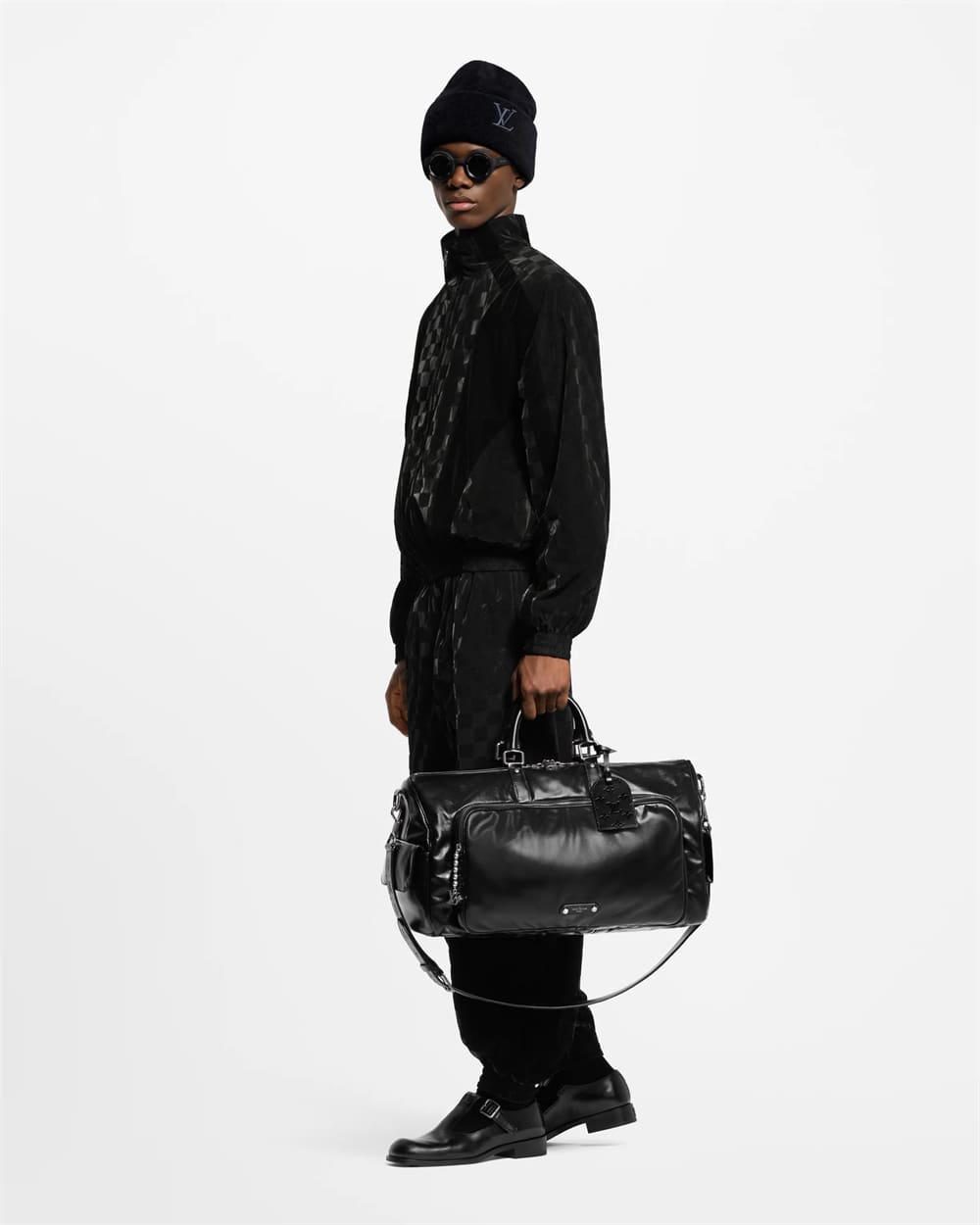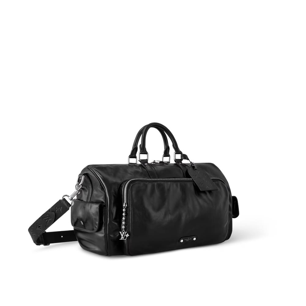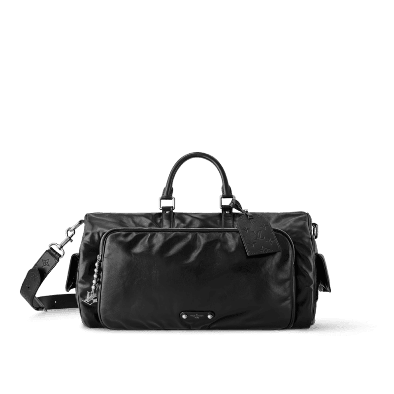 Pharrell Williams evokes the mystique of night with this Keepall Cargo Bandoulière 50 cloaked in the darkest black. Made from glossy black calfskin, the Keepall’s classic lines shimmer in the light. The silver-toned hardware, such as the LV Initials charm on the zip pull of the outside zipped pocket, perfectly complements the gleam of the leather.