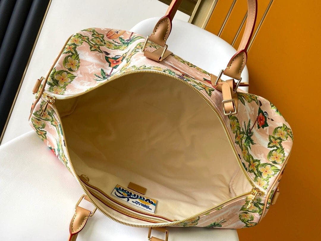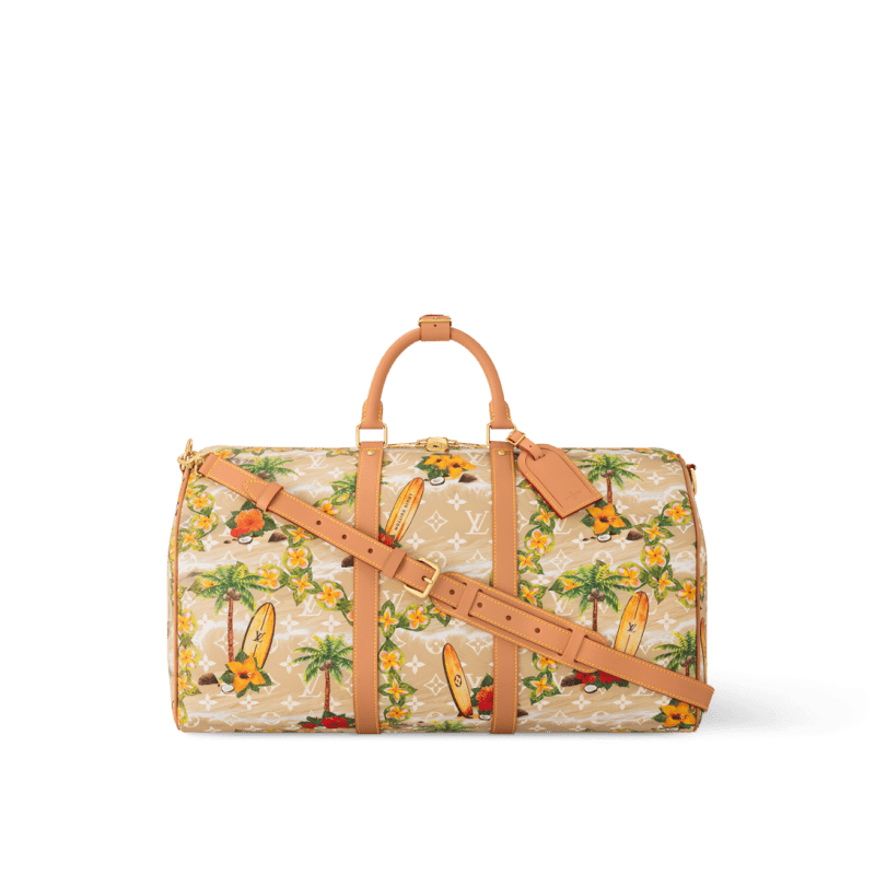 The classic Keepall Bandoulière 50 travel bag is eye-catching in Pharrell Williams’ Monogram Surfin’ coated canvas. The elaborate print juxtaposes vintage-style tropical motifs with classic House patterns like the Monogram Flowers. The Keepall is trimmed with natural cowhide-leather to give the bag a vintage feel.