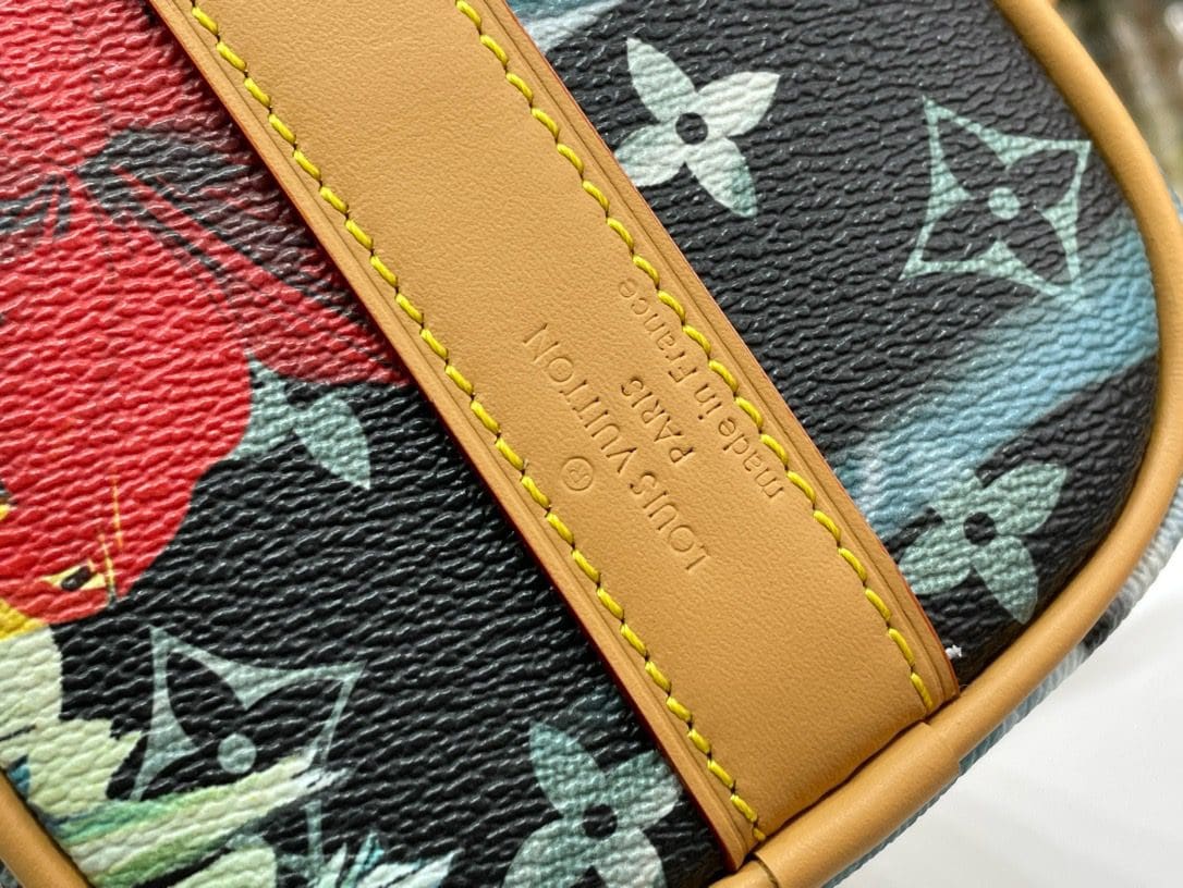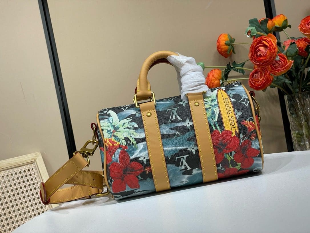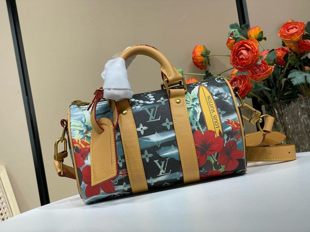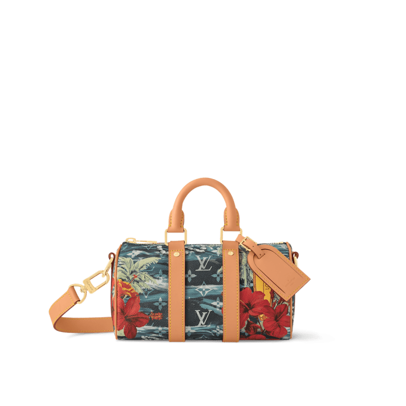 The Keepall Bandoulière 25 is a smaller version of Louis Vuitton’s famous Keepall travel bag. It’s made from Pharrell Williams’ Monogram Surfin’ canvas, with its intricate print combining different summery motifs. The bag’s design and tropical print give this city bag a vintage feel. A detachable strap and two rolled-leather top handles enable carry options.
