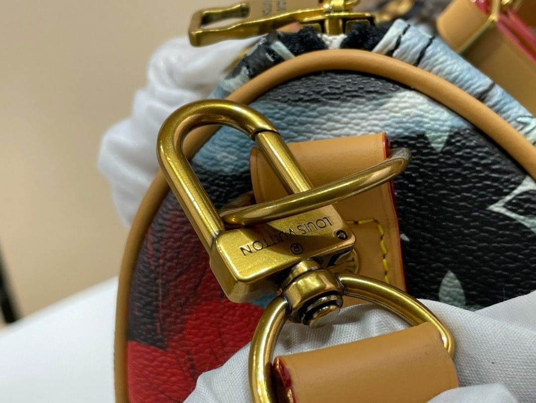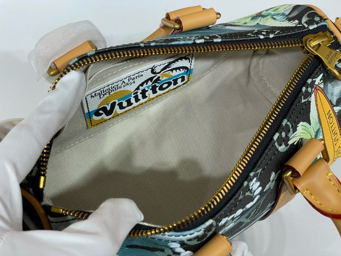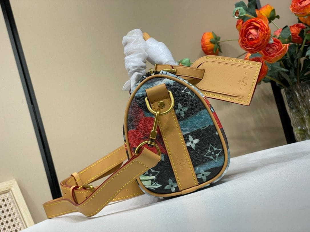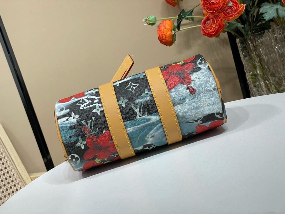 The Keepall Bandoulière 25 is a smaller version of Louis Vuitton’s famous Keepall travel bag. It’s made from Pharrell Williams’ Monogram Surfin’ canvas, with its intricate print combining different summery motifs. The bag’s design and tropical print give this city bag a vintage feel. A detachable strap and two rolled-leather top handles enable carry options.