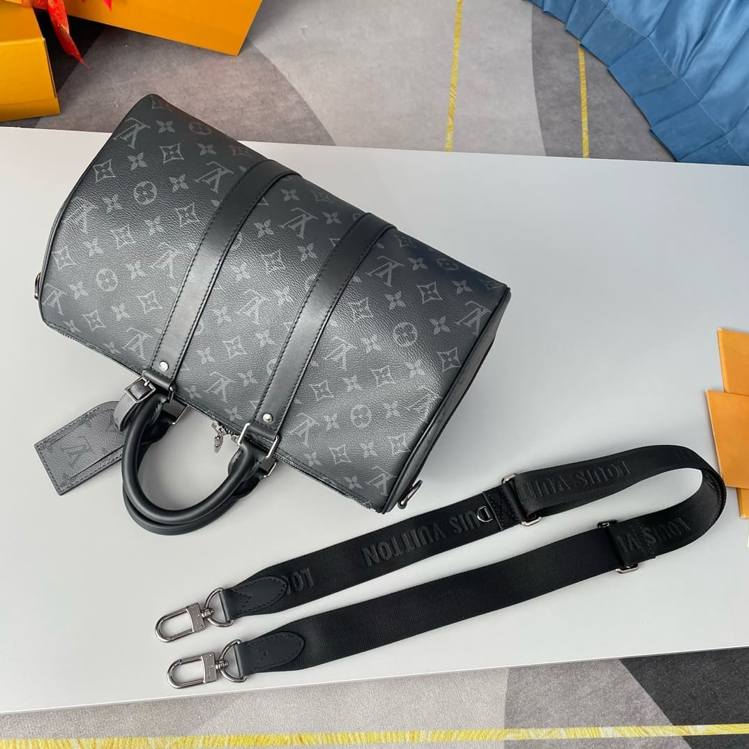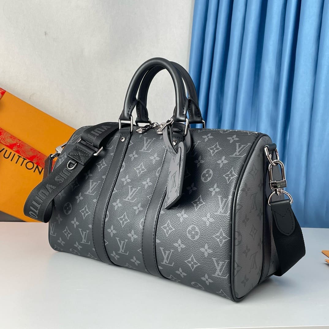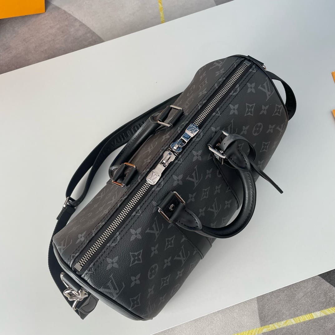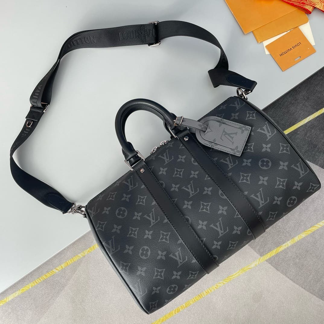 Monogram Eclipse coated canvas brings understated sophistication to this Keepall Bandoulière 35 bag. The black leather on the top handles and side bands, and palladium-color hardware, emphasize the bag’s timeless design. The strap is detachable and adjustable and enables comfortable shoulder carry.