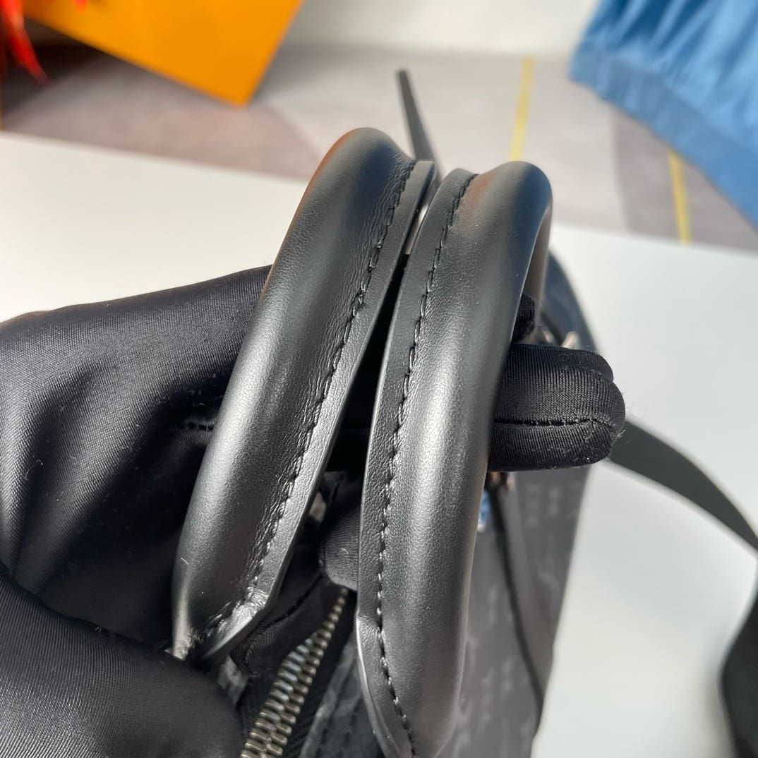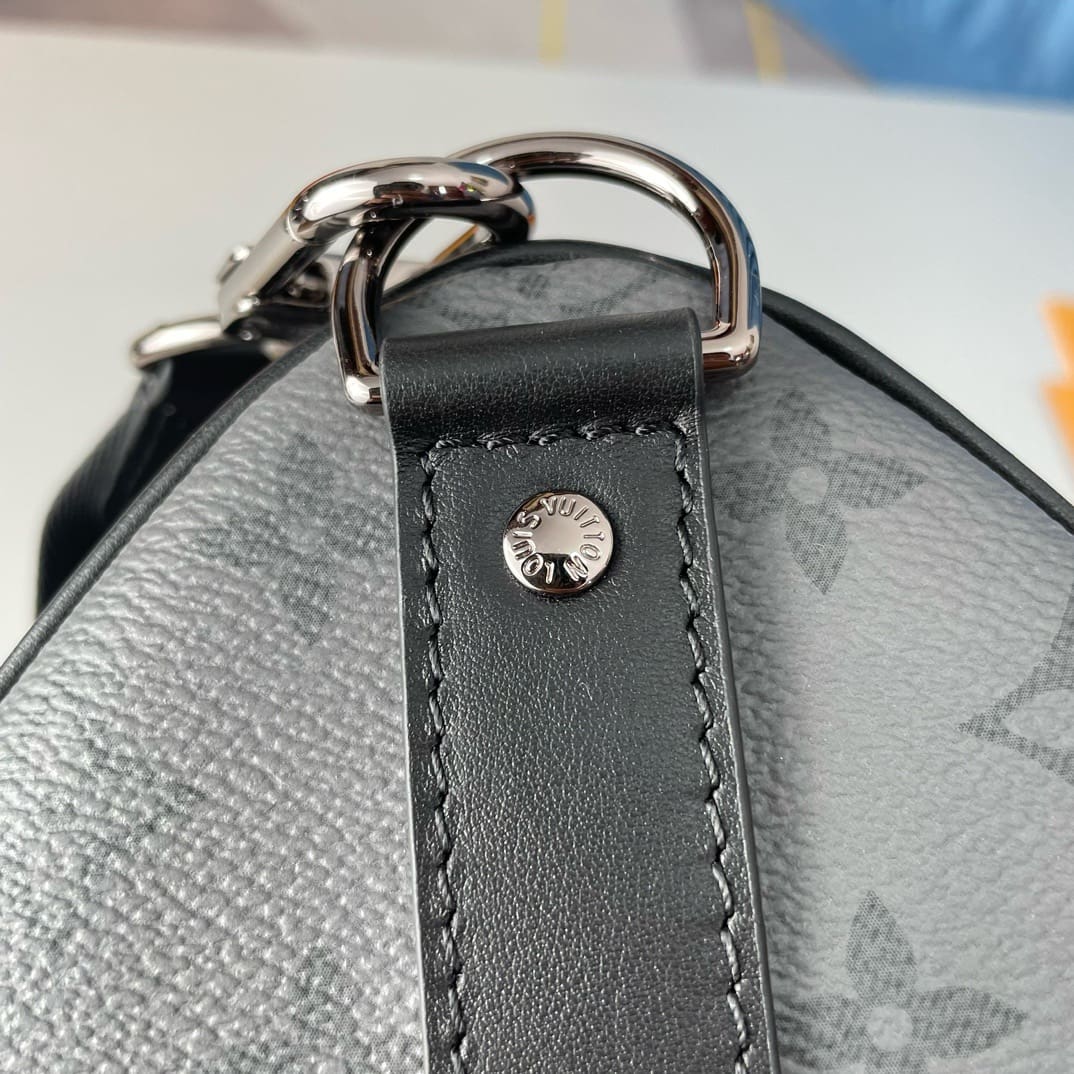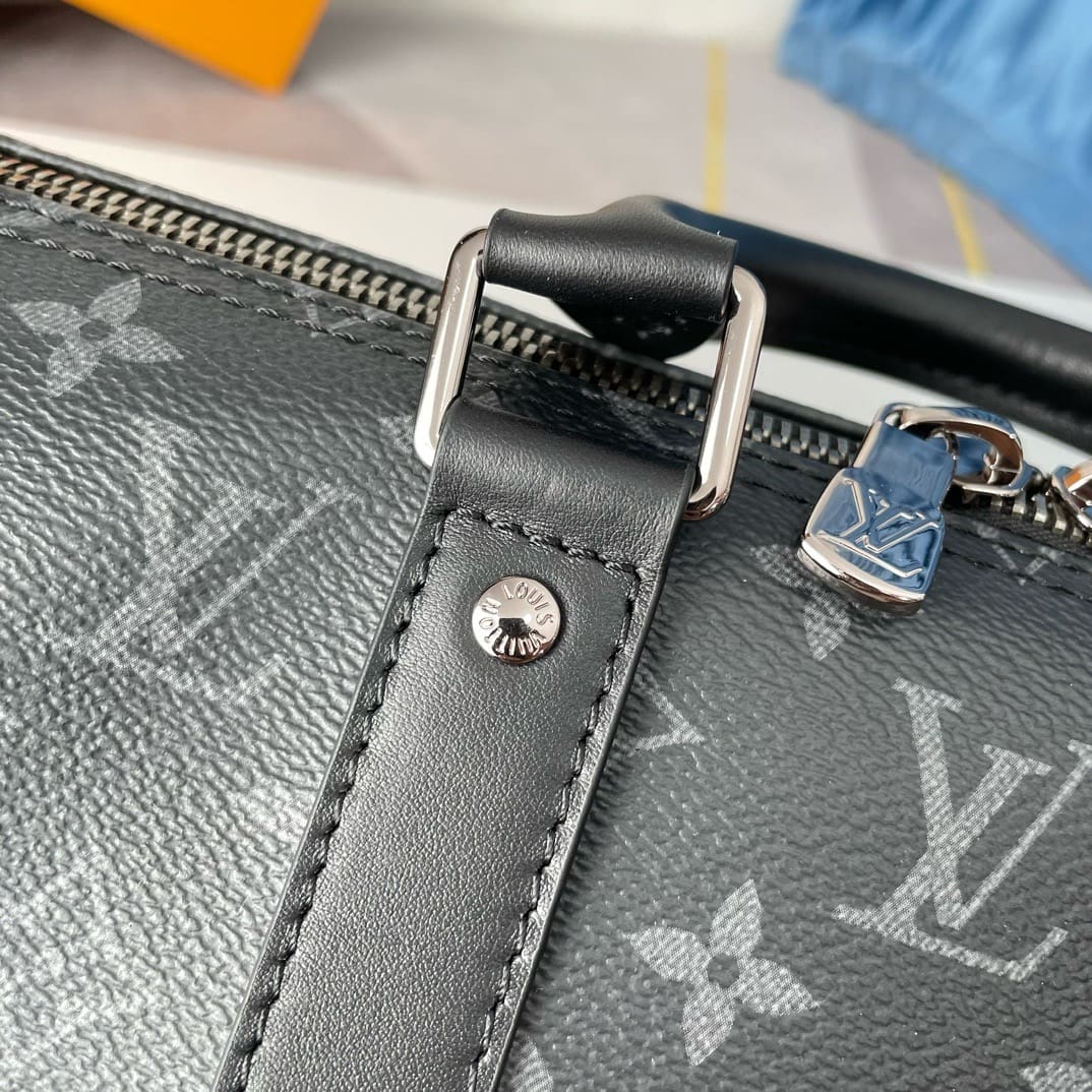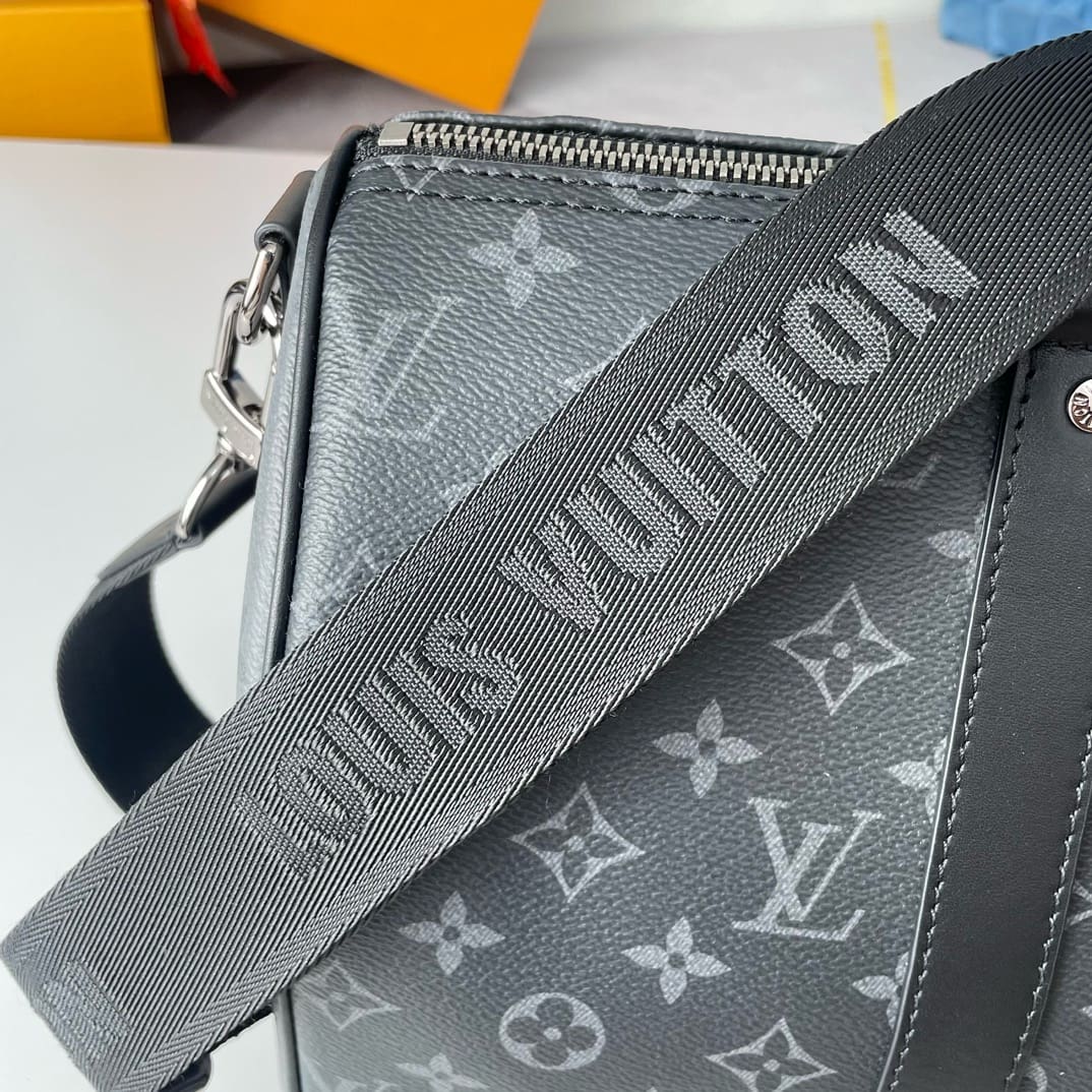 Monogram Eclipse coated canvas brings understated sophistication to this Keepall Bandoulière 35 bag. The black leather on the top handles and side bands, and palladium-color hardware, emphasize the bag’s timeless design. The strap is detachable and adjustable and enables comfortable shoulder carry.