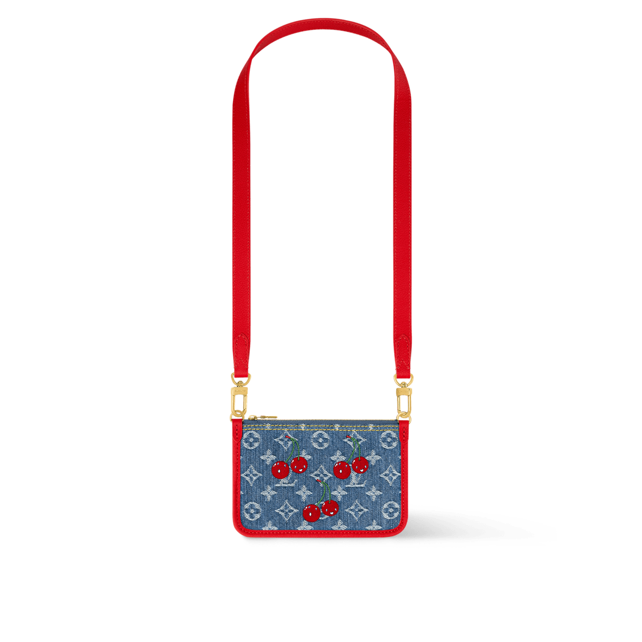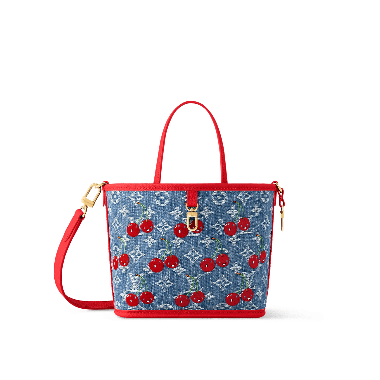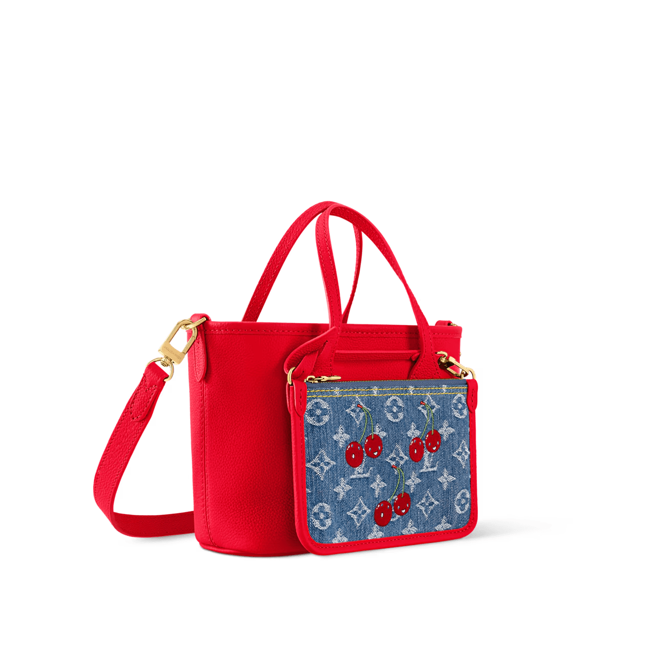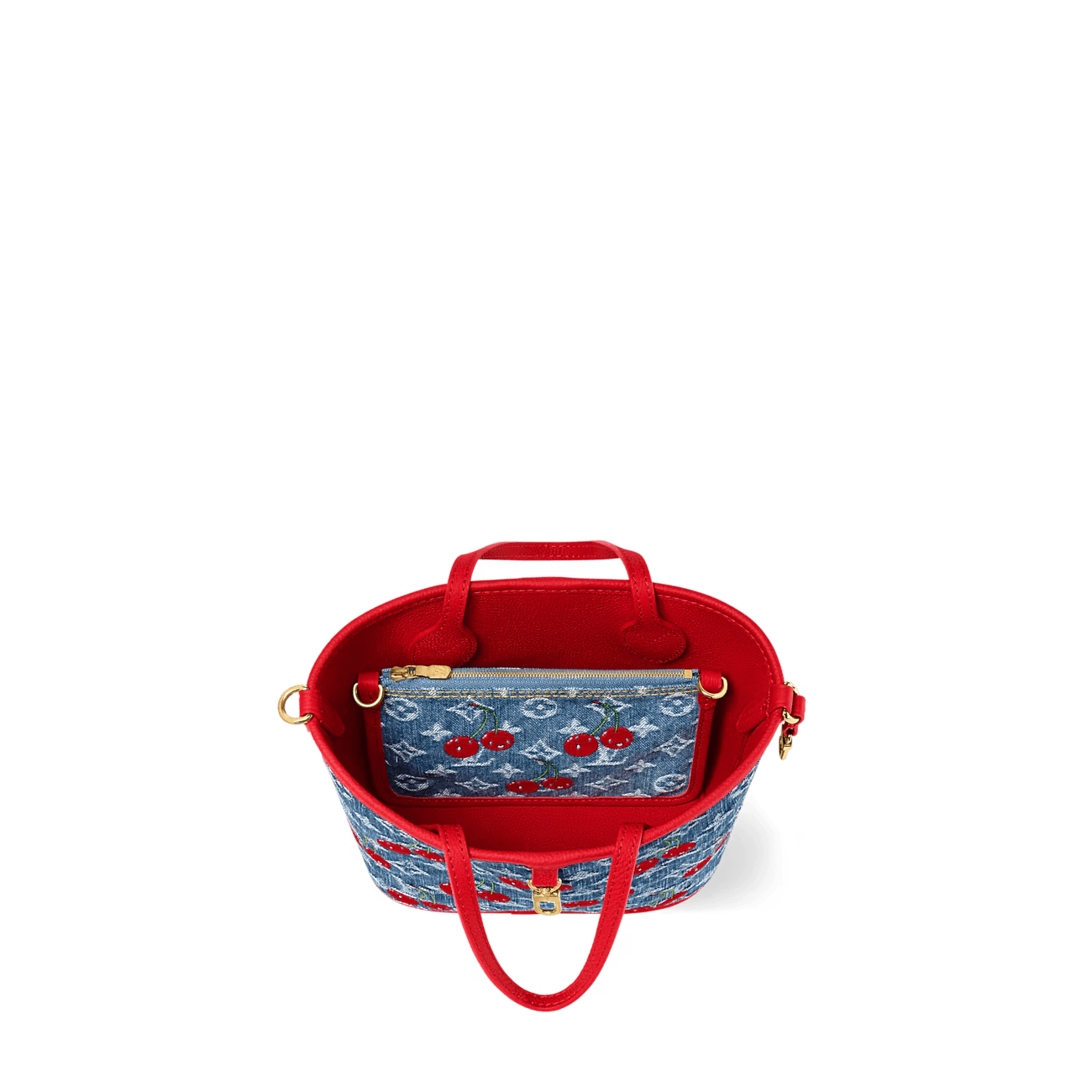 Striking signatures from the exclusive re-edition of the cross-category Louis Vuitton x Murakami collection elevate the Neverfull Inside Out BB into a playful statement piece. Crafted from Monogram denim, embroidered cherry motifs in the Japanese artist??s iconic style introduce a vibrant burst of color, which is complemented by red calf-leather trims. A removable denim zipped pouch completes this exclusive model.