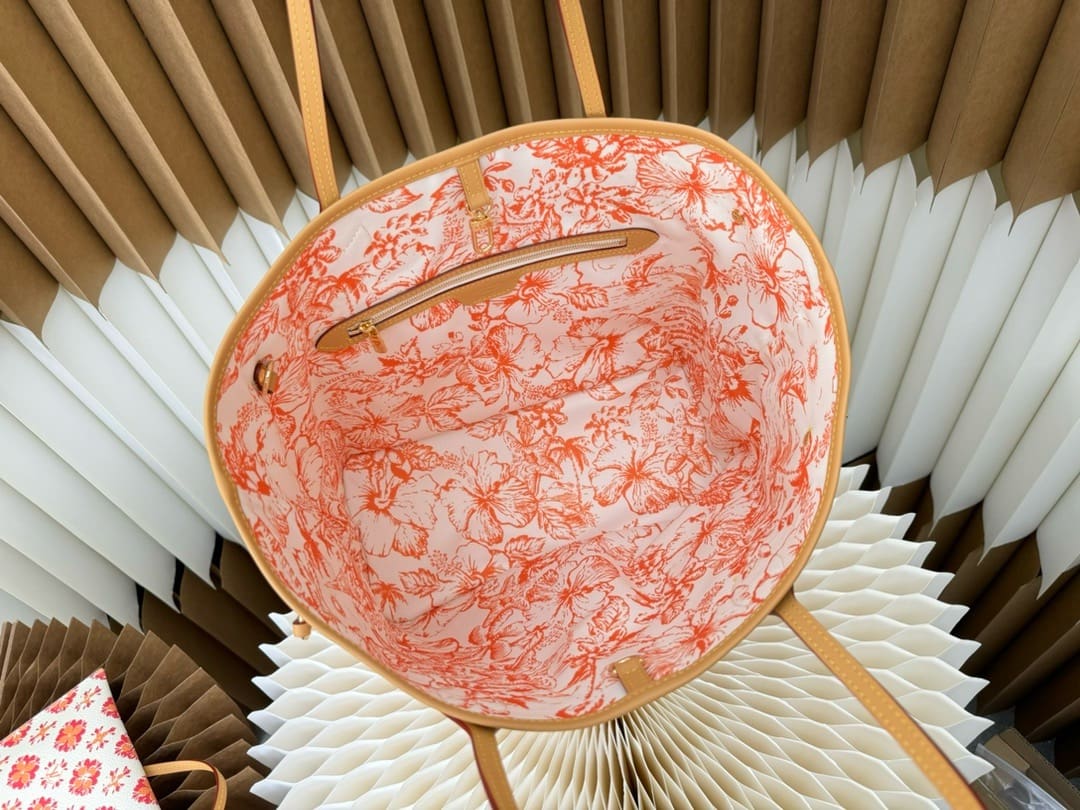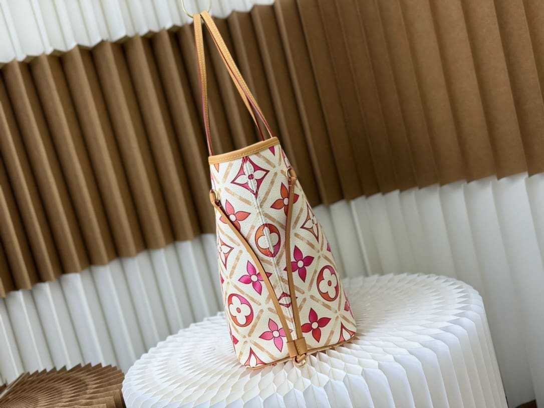 The Neverfull MM tote is made from Monogram Tiles canvas with leather trim along the top of the bag and on the handles. The Monogram pattern has a watercolor aspect and features the LV Circle in the center. It comes with a zipped pouch, with a complementary print, that can be removed and used separately.