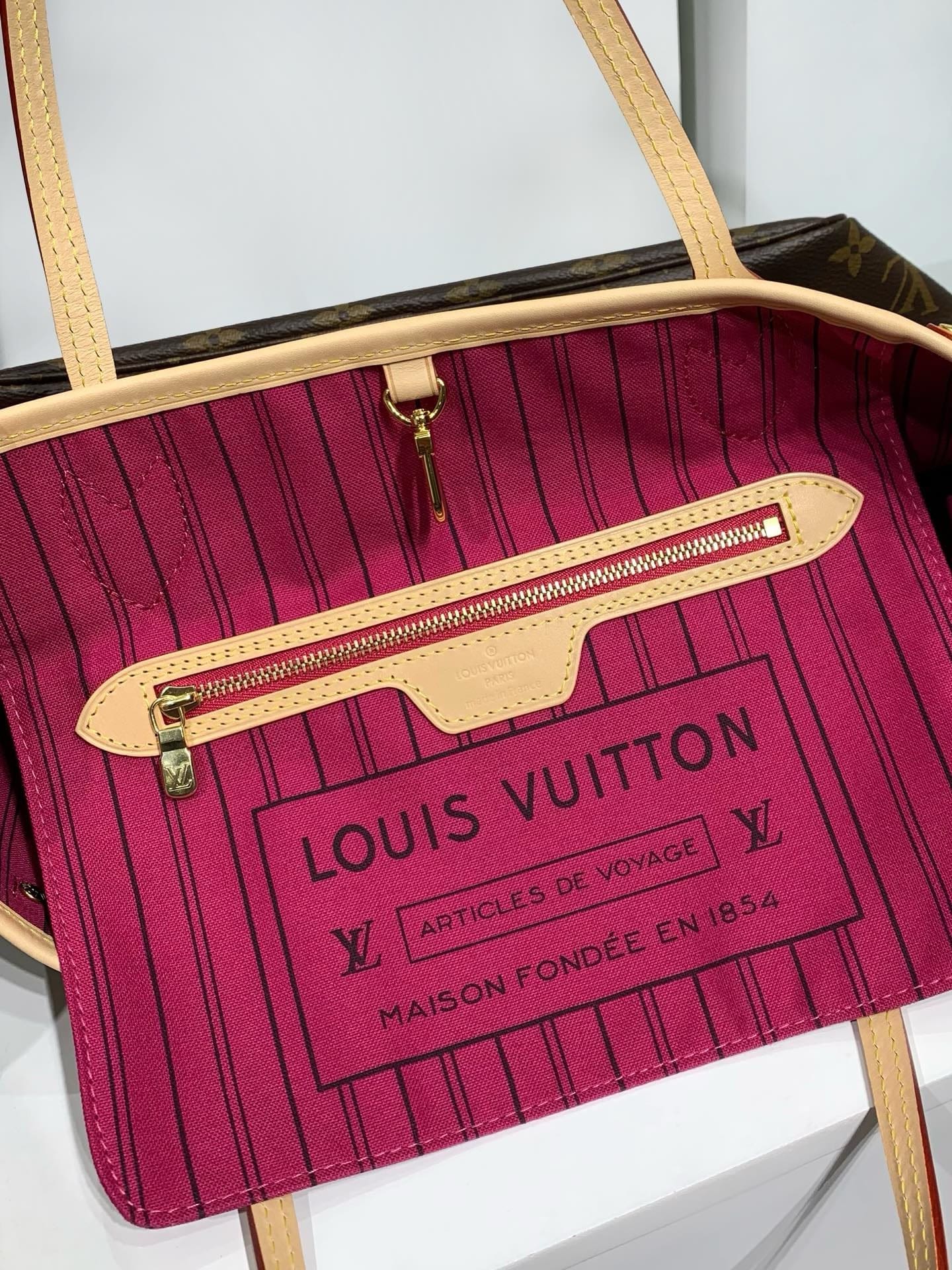 Louis Vuitton celebrates the NeverFull with a new version of this iconic bag, in a smaller size perfect for city wear. The redesigned interior features a fresh textile lining and heritage details inspired by House archives. Best of all, the removable zippered clutch can be carried separately as a chic pochette or serve as an extra pocket. Linings in a selection of bright shades lend a pop of vivid color to the timeless Monogram canvas.