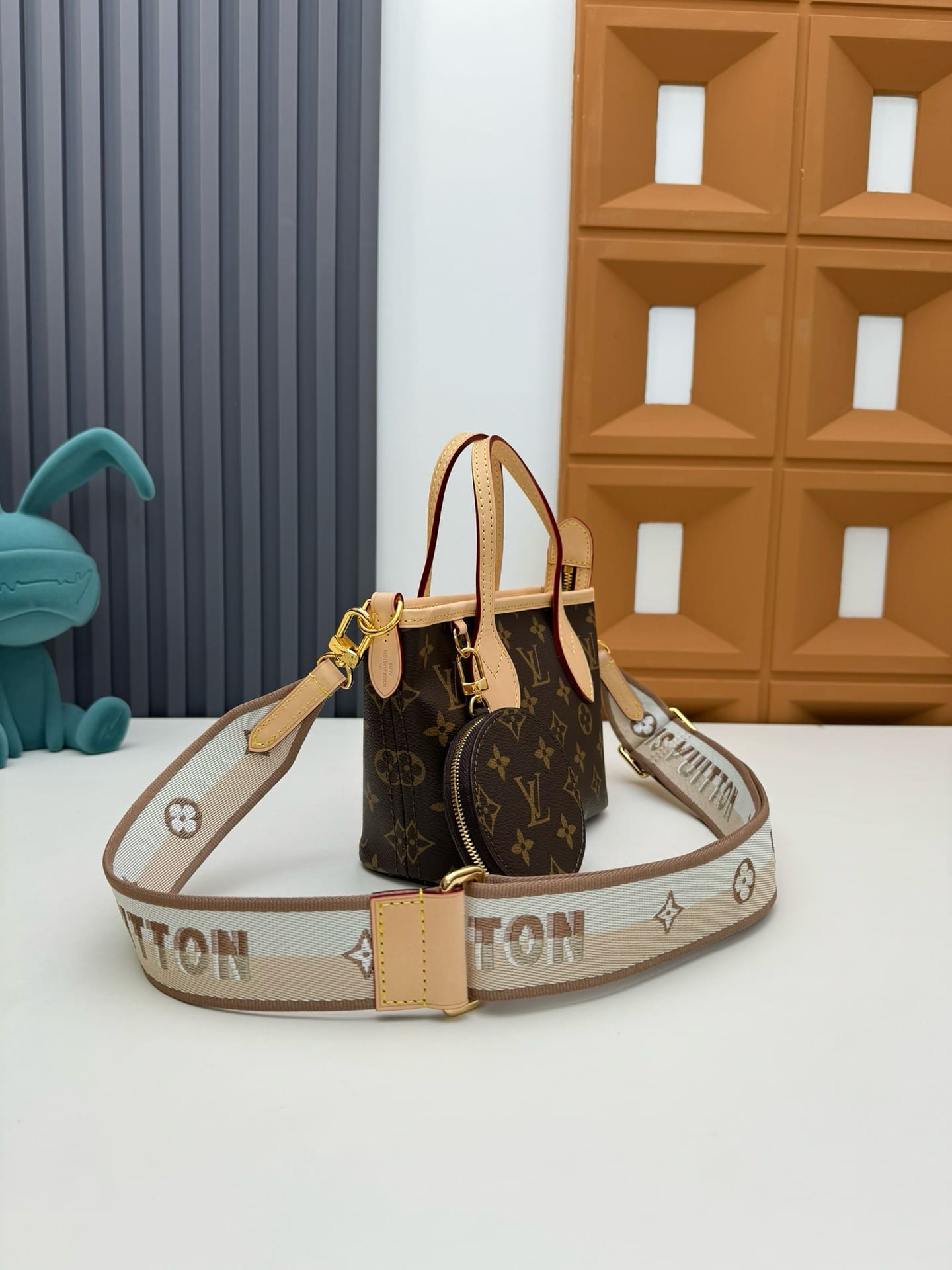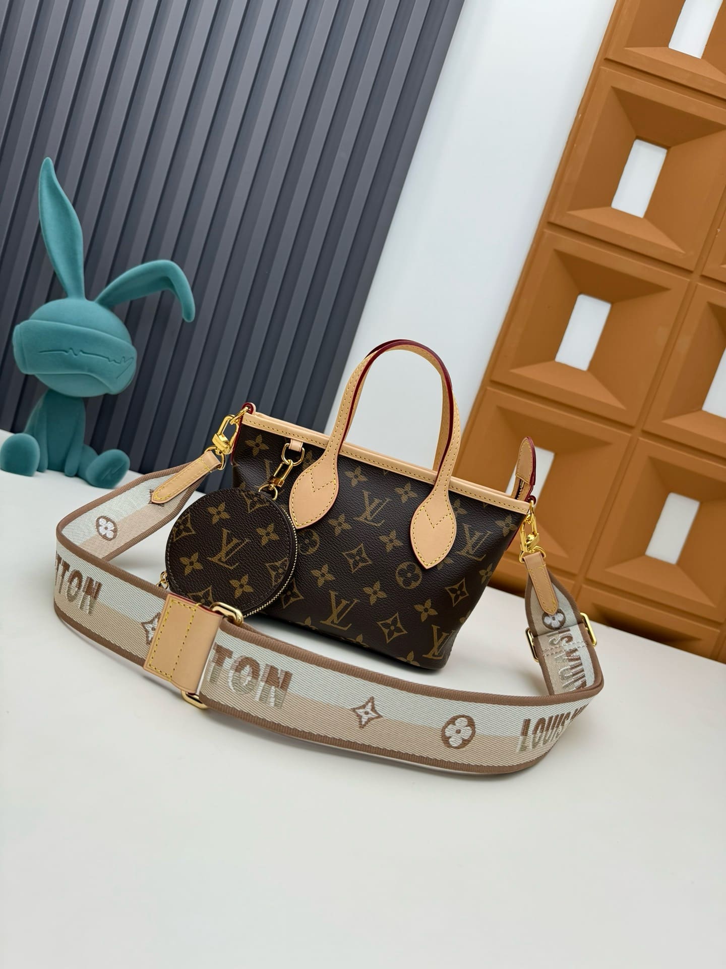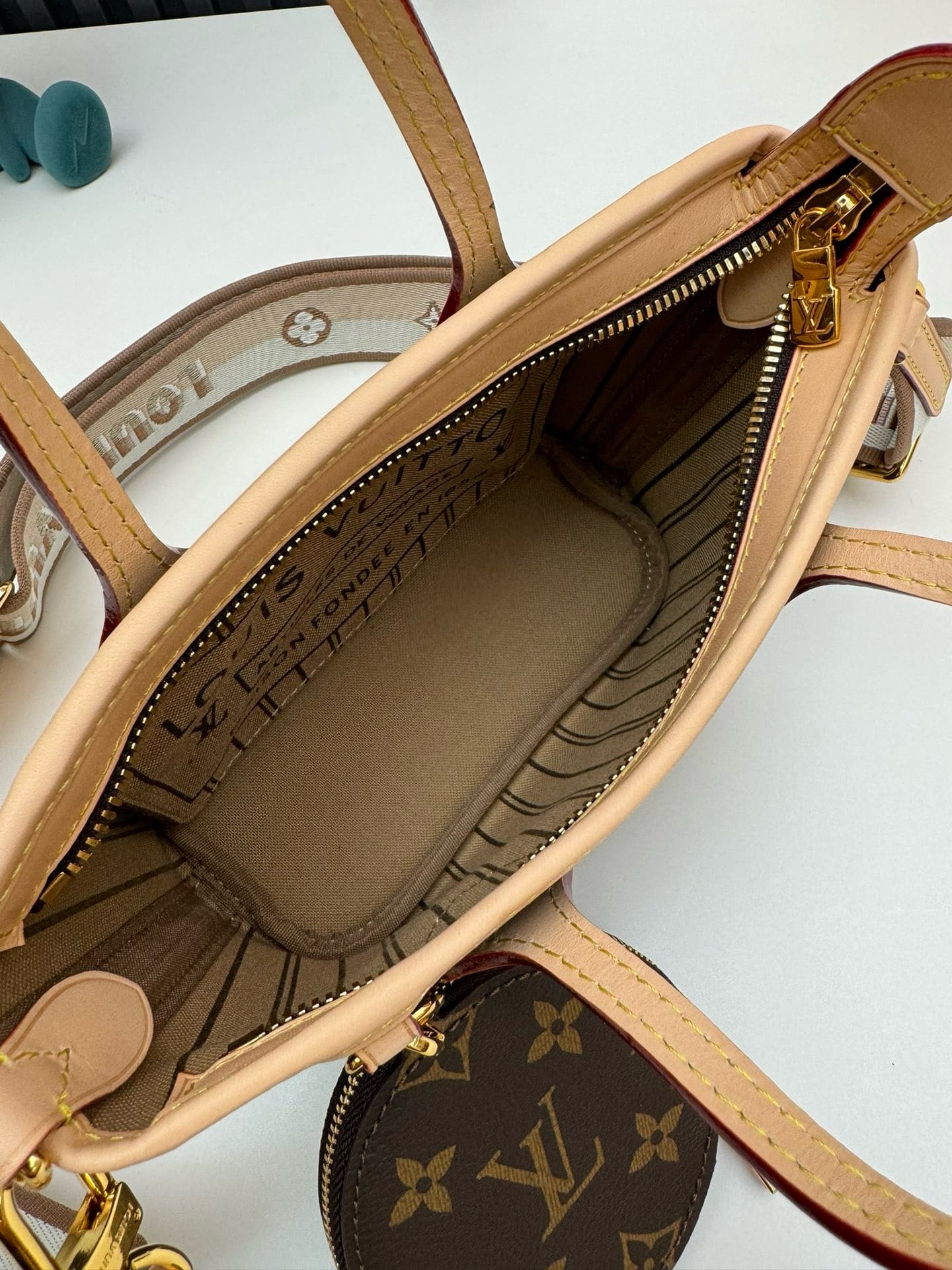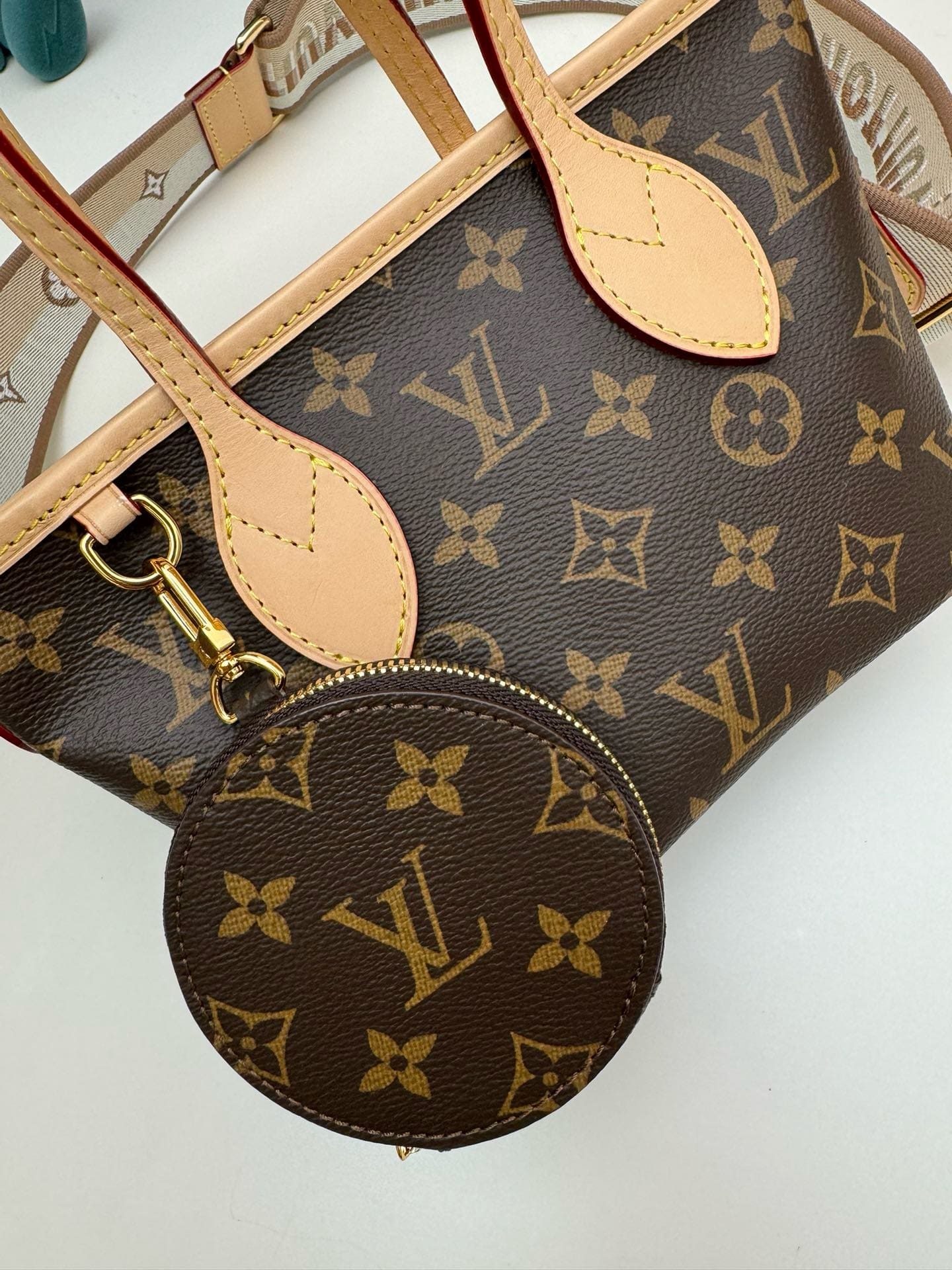 This season the House??s forever favorite, the Neverfull, gets reinvented as a mini-tote: the Neverfull BB handbag. This scaled-down version features an adjustable and detachable textile strap as well as a playful coin purse attached to a D-ring. It is just the right size for small essentials like a smartphone and compact wallet.