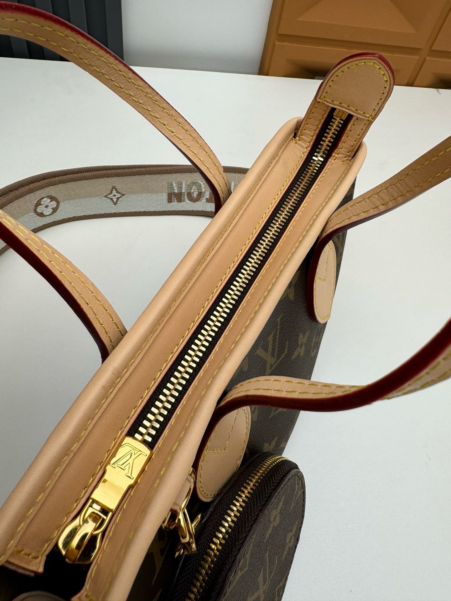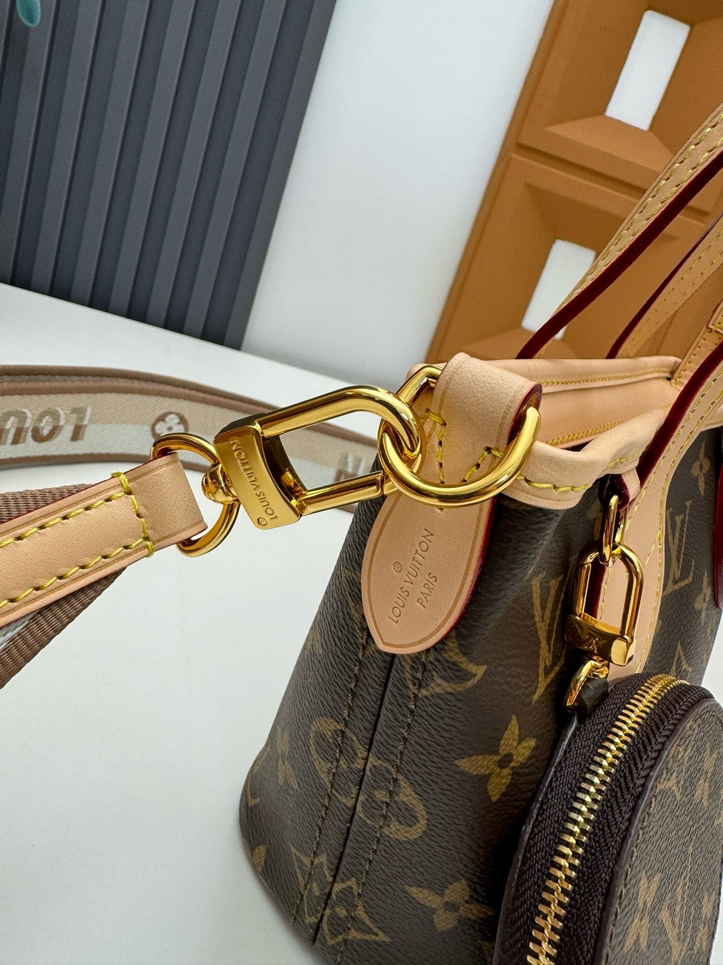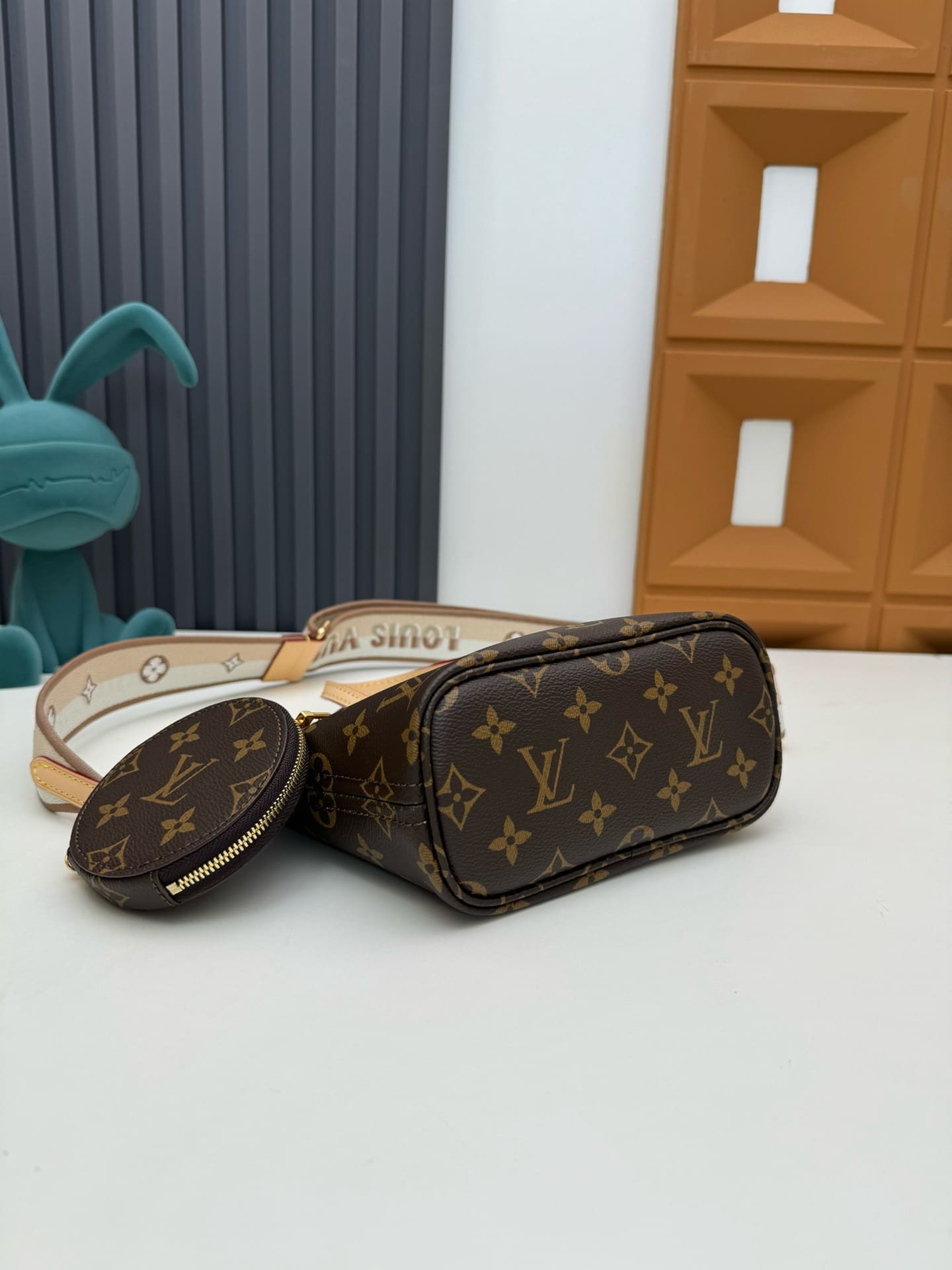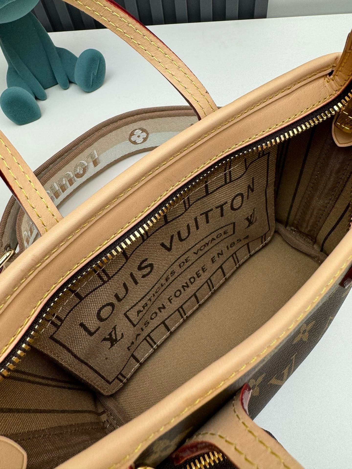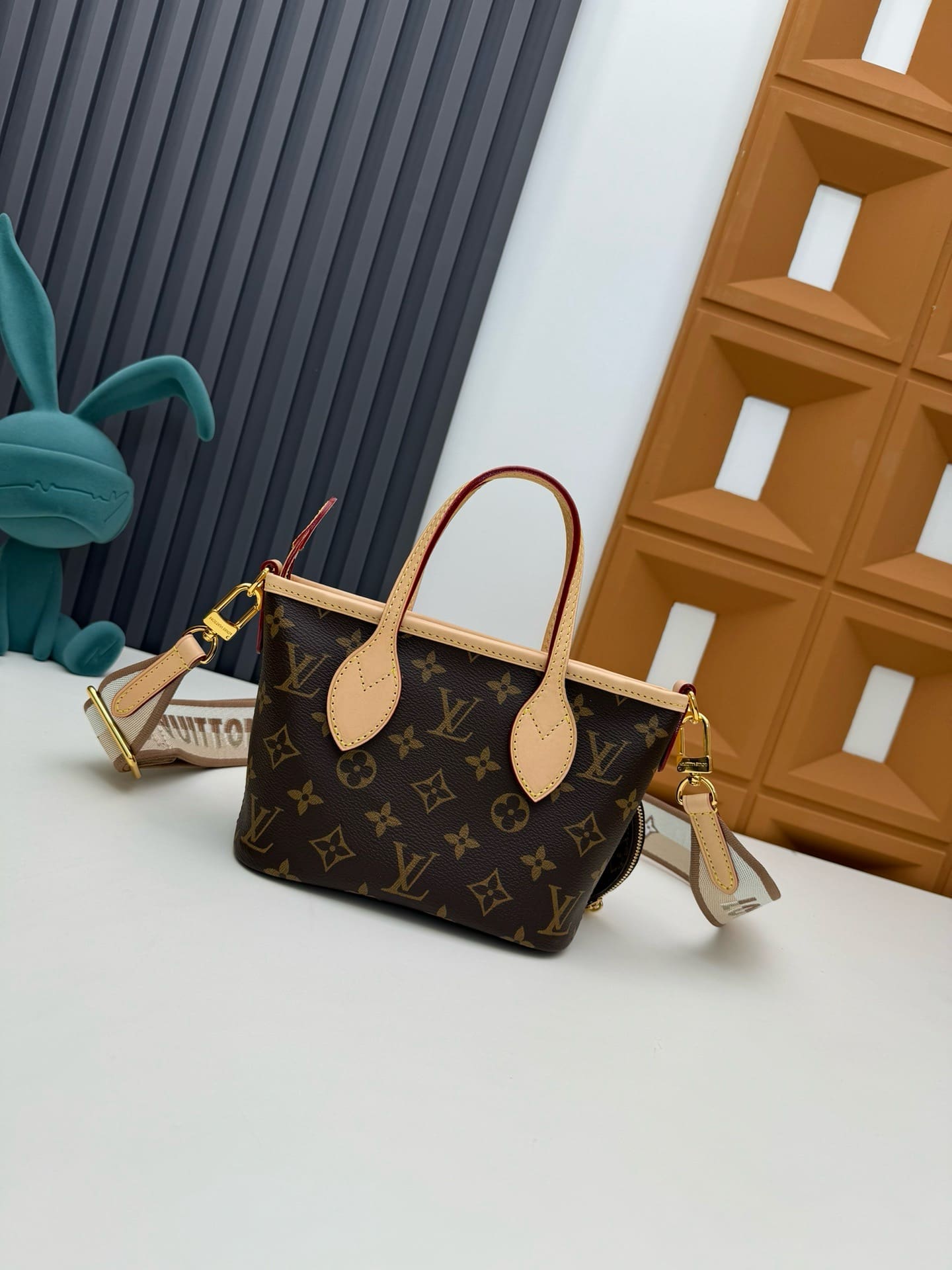 This season the House??s forever favorite, the Neverfull, gets reinvented as a mini-tote: the Neverfull BB handbag. This scaled-down version features an adjustable and detachable textile strap as well as a playful coin purse attached to a D-ring. It is just the right size for small essentials like a smartphone and compact wallet.