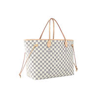 The Neverfull GM tote unites timeless design with heritage details. Crafted from fresh Damier Azur canvas with natural cowhide trim, it is ultra-roomy yet never bulky, with side laces that cinch for a sleek allure or loosen for a more casual look. Slim, comfortable handles slip easily over the shoulder or arm. Lined in colorful textile, it features a removable pouch which can serve as a clutch or an extra pocket.