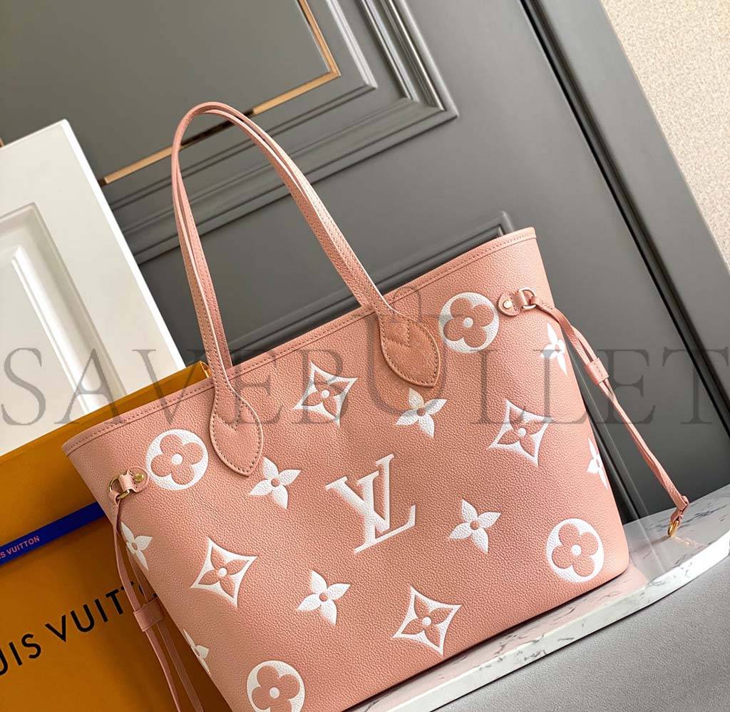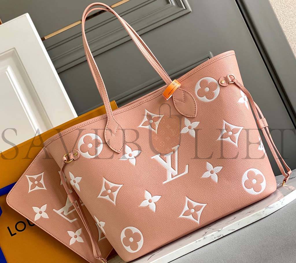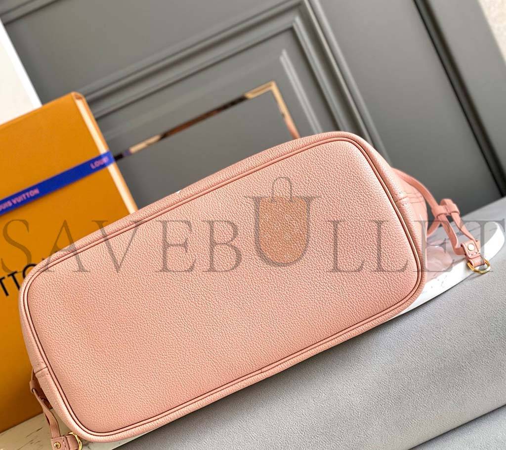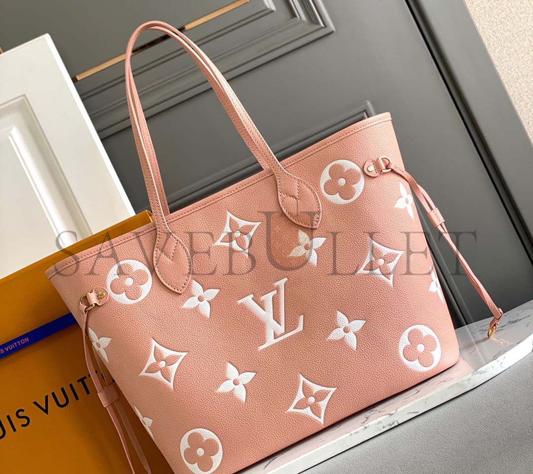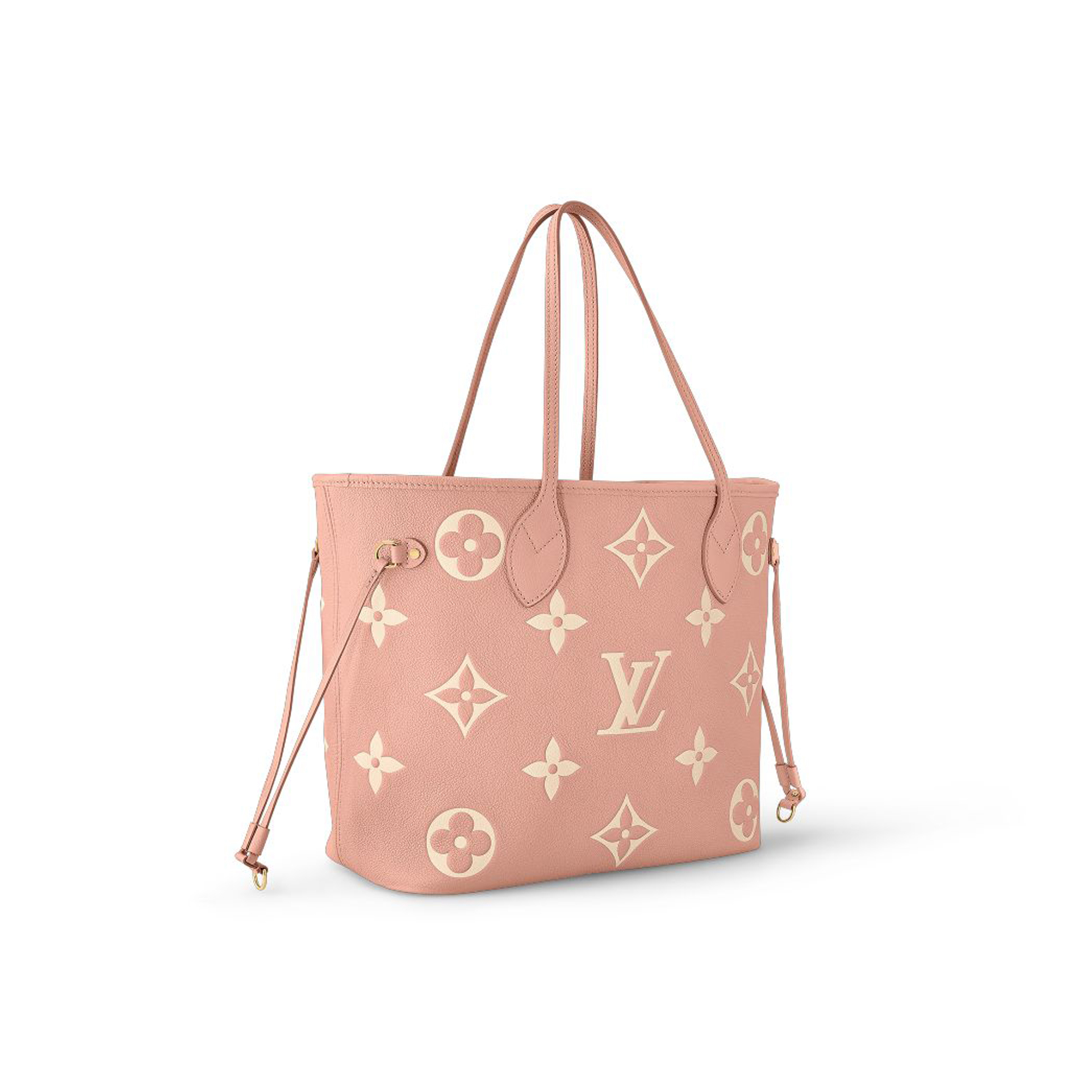 The Neverfull MM tote bag is made from embossed Monogram Empreinte leather with cream-color Monogram Blossoms and LVs on a pink background. Versatile, the side laces of the roomy bag can be tightened for a sleeker silhouette or loosened for a more casual look and easy access to what��s inside.