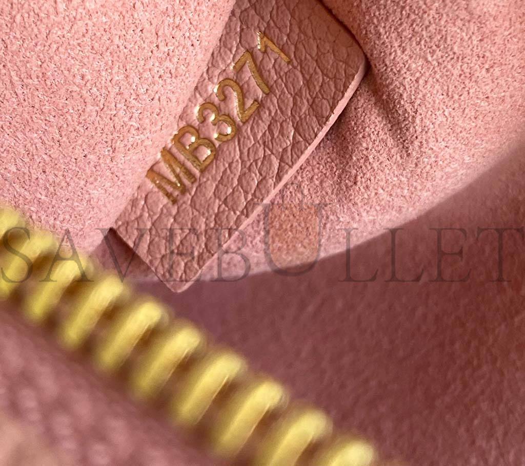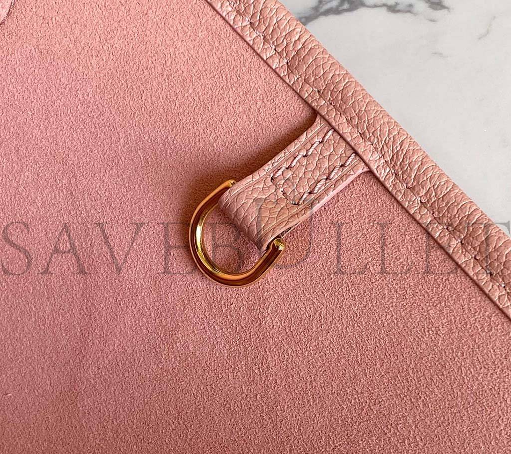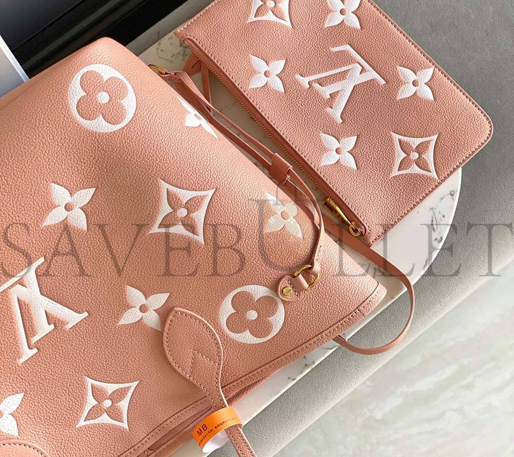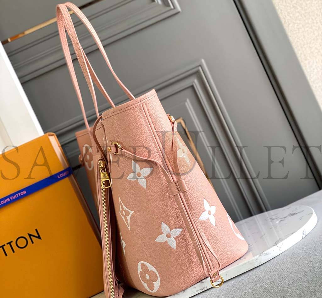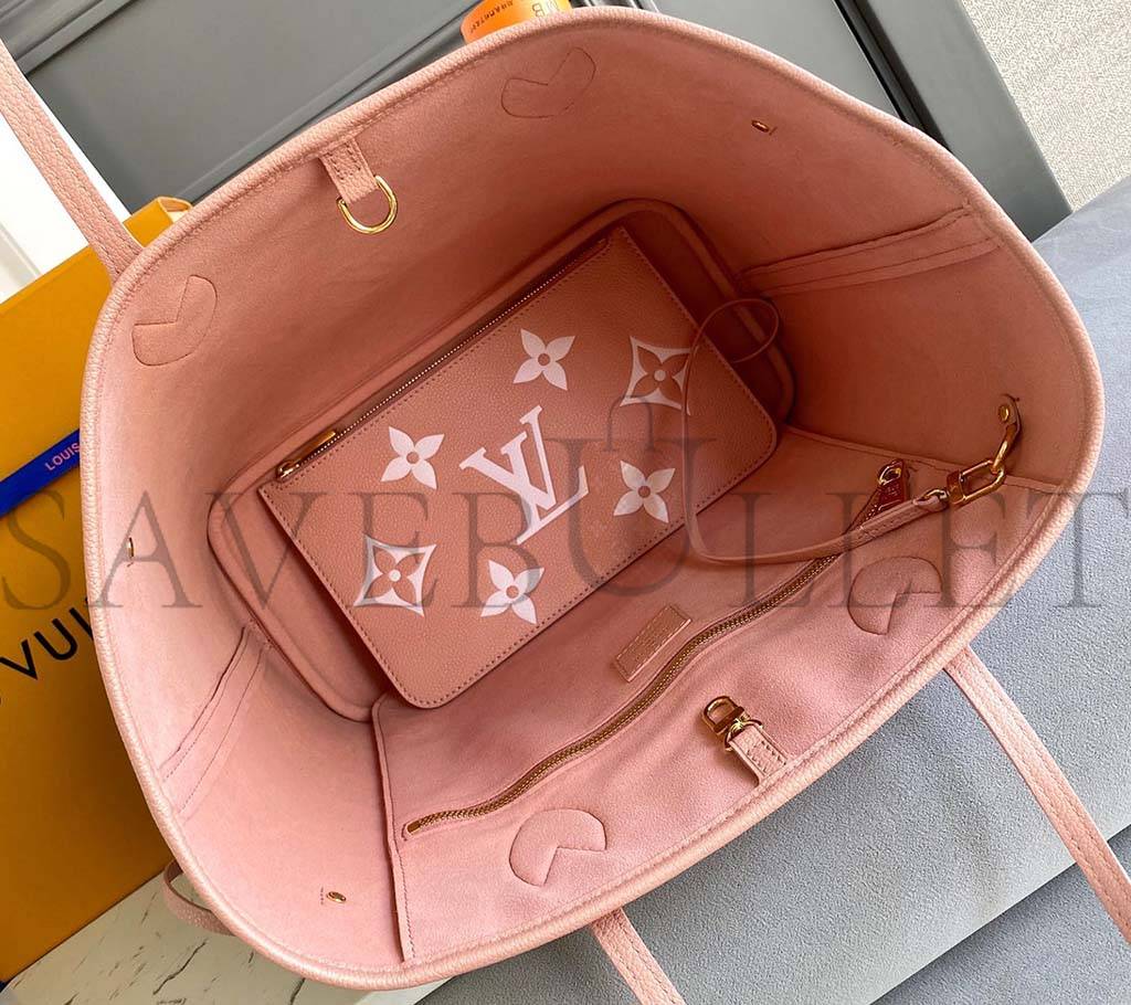 The Neverfull MM tote bag is made from embossed Monogram Empreinte leather with cream-color Monogram Blossoms and LVs on a pink background. Versatile, the side laces of the roomy bag can be tightened for a sleeker silhouette or loosened for a more casual look and easy access to what��s inside.