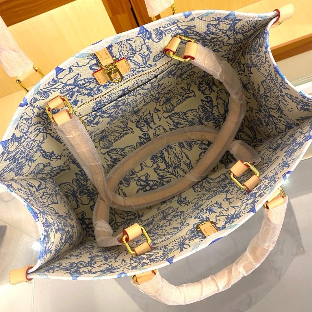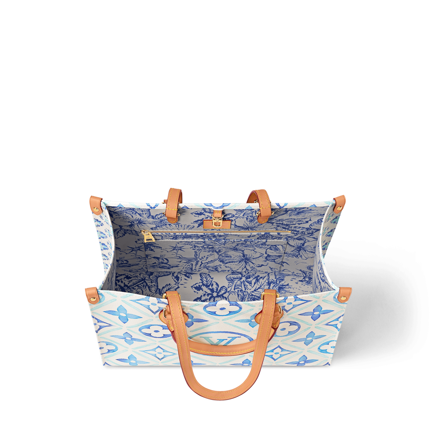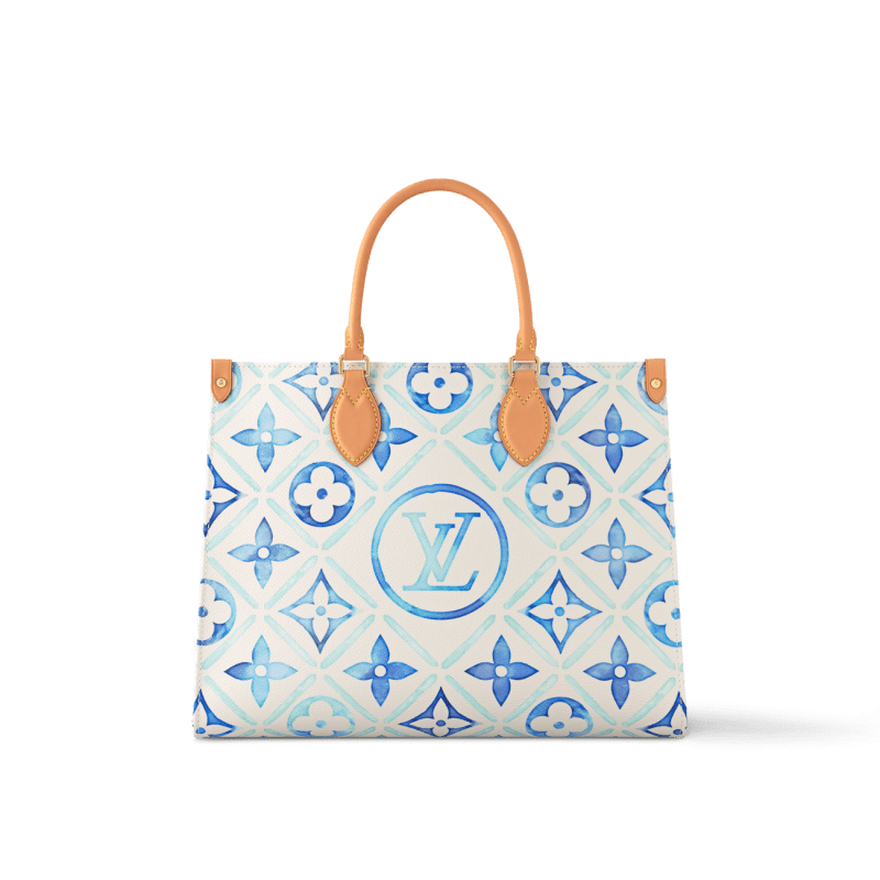 This OnTheGo MM tote is made from Monogram Tiles canvas, with its watercolor-style Monogram print and LV Circle centered on the bag. The two top handles, and concealed shoulder straps, are in cowhide leather, as are the four riveted corner tabs. This roomy bag can easily carry a laptop as well as other daily necessities.