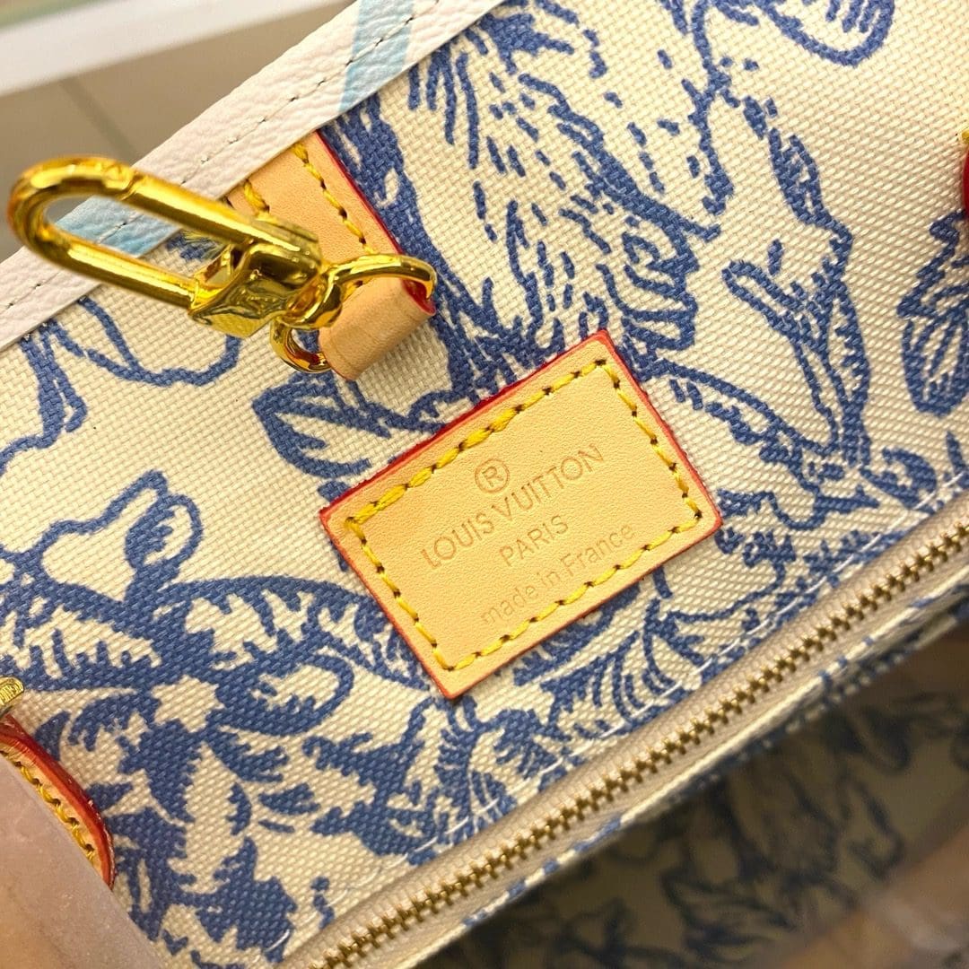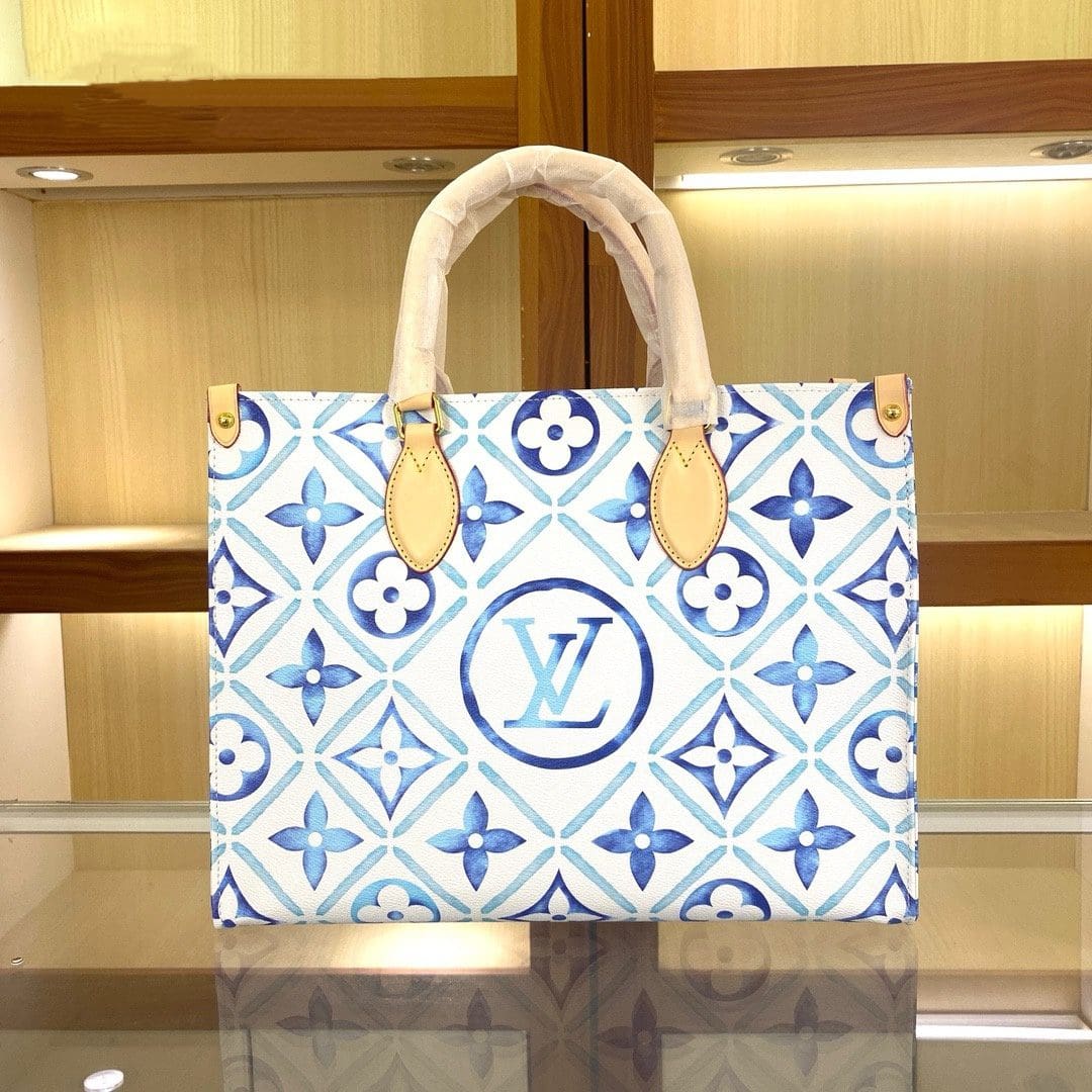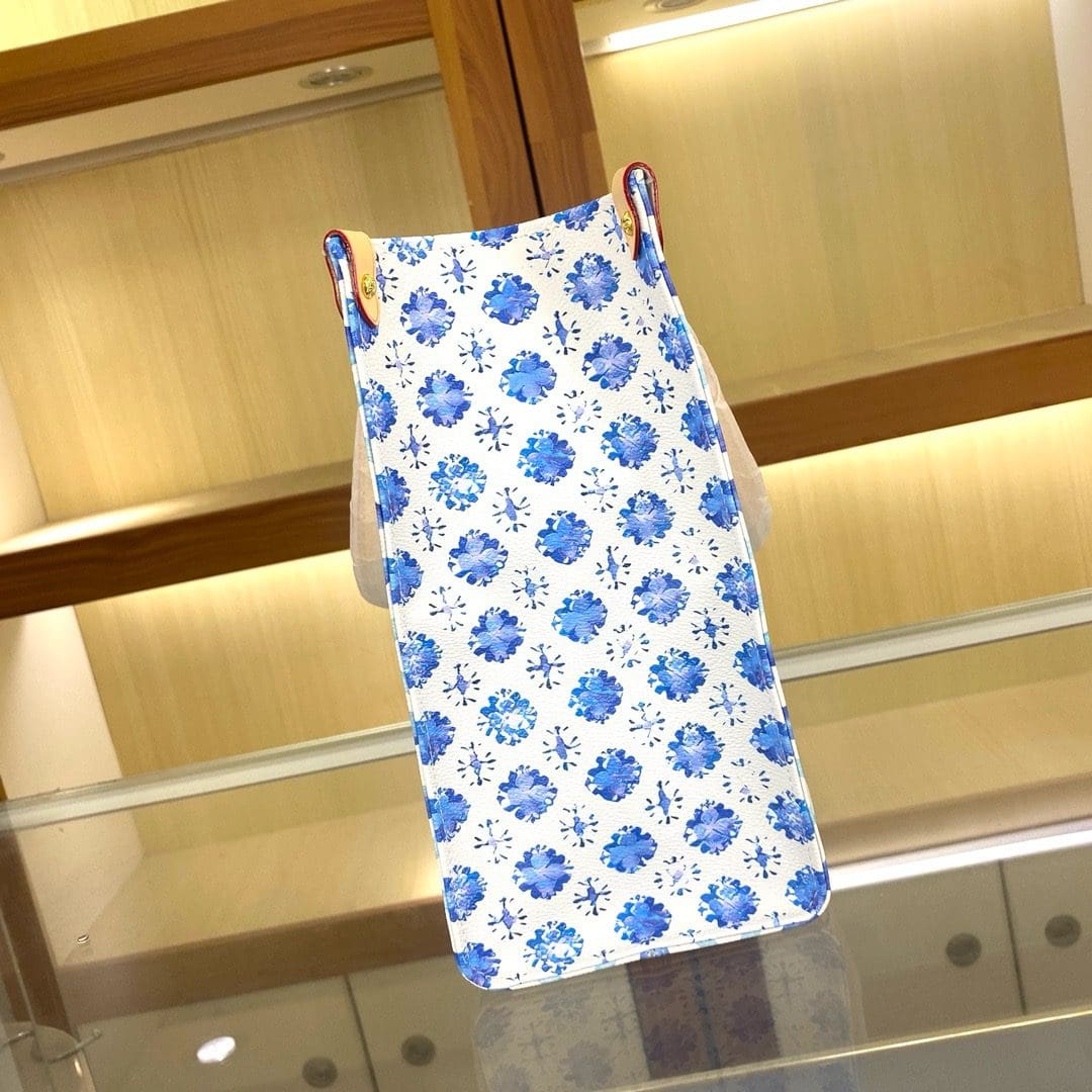 This OnTheGo MM tote is made from Monogram Tiles canvas, with its watercolor-style Monogram print and LV Circle centered on the bag. The two top handles, and concealed shoulder straps, are in cowhide leather, as are the four riveted corner tabs. This roomy bag can easily carry a laptop as well as other daily necessities.