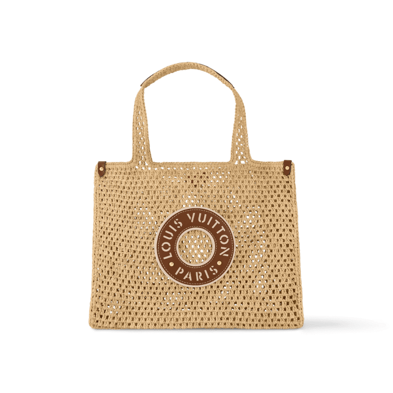 As part of the LV By The Pool Collection, the OnTheGo MM tote is made from hand-crocheted 100% natural raffia. The riveted corners are in cowhide leather, as is the circular “Louis Vuitton Paris” patch on the front. The OnTheGo MM can fit 13-inch laptop and a beach towel as well other essentials.