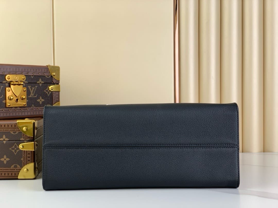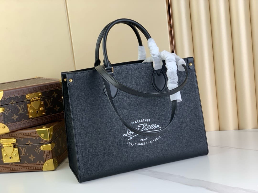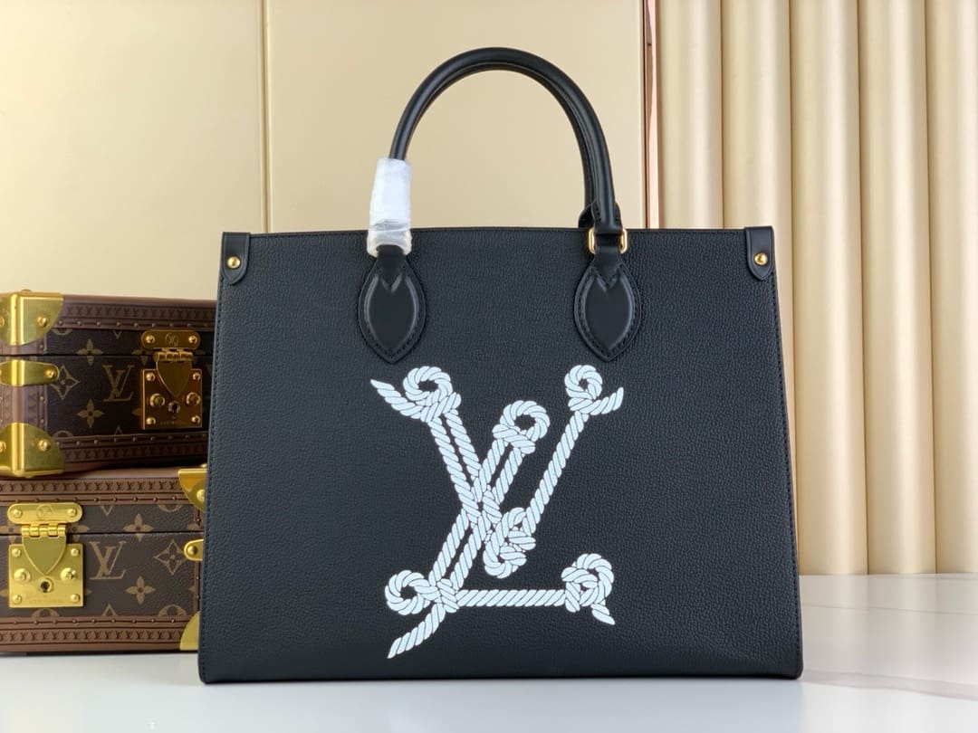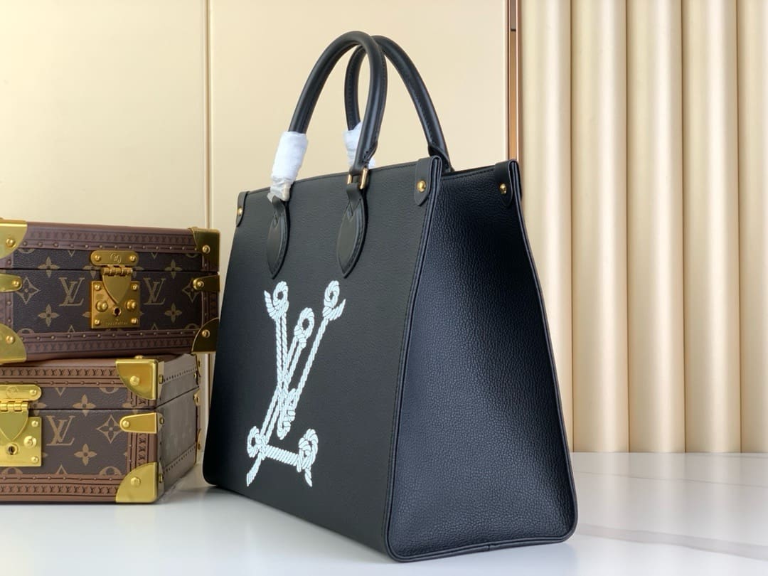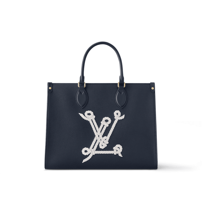 Part of the Nautical Collection, this OnTheGo MM in calfskin has been reimagined with a marine-inspired twist. The signature LV Initials are rendered in the style of sailors’s knots. The 3D embroidery reproduces the feel of an actual rope. A giant LV adorns the front, while the back reads “Louis Vuitton Malletier.”