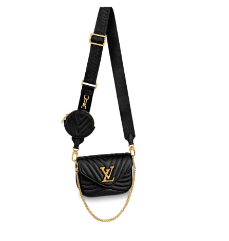 Louis Vuitton introduces the versatile New Wave Multi Pochette cross-body bag in quilted cowhide leather. Its wide strap features an embroidered 'Louis Vuitton' signature and its gold-colour chain for hand or short-shoulder carry are both removable, making it the very definition of a versatile fashion accessory. Plus, it comes complete with a removable round coin purse clipped on the strap’s snap hook.