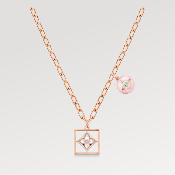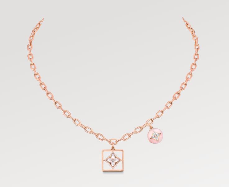 Worn alone or layered, with off-duty outfits or dressy silhouettes, this eye-catching B Blossom necklace always strikes the right modern note. Beautifully crafted from polished 18-kt pink gold, it features two Monogram Flower charms, one in lustrous mother-of-pearl and the other set with two half-spheres of pink opal, both set with glistening diamonds.