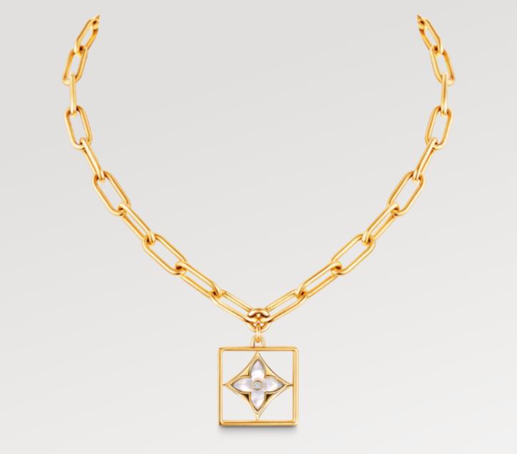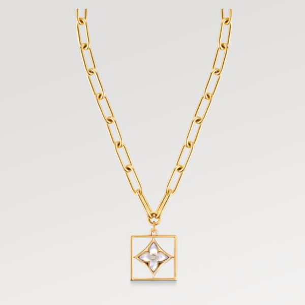 The iconic Monogram Flower blooms boldly on this 18-kt yellow-gold necklace from the B Blossom collection. Carved from white mother-of-pearl, the motif is accented with a brilliant diamond and framed in gold. With its geometric lines and sculptural volumes, this jewel will lend a modern touch to any silhouette.
