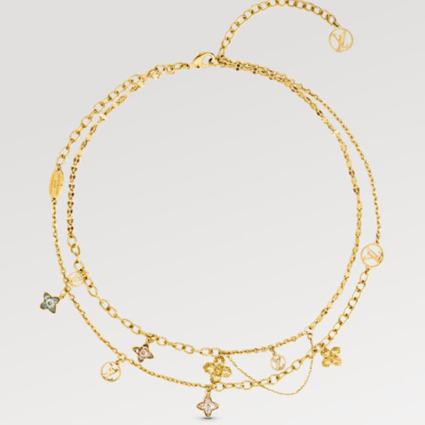 Inspired by one of Louis Vuitton’s textile prints, the Blooming Strass necklace creates an elegant look. Monogram Flower charms in gold-tone metal and crystals are strung on multiple fine gold-color chains, creating an on-trend layered effect. An LV Circle adds a signature touch to the end of the adjustable chain.