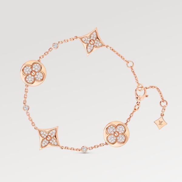 Cast from 18-kt pink gold, the Color Blossom BB bracelet is ornamented with Monogram Flower motifs set with dazzling pavé diamonds. The emblematic sun and star shapes alternate on the adjustable chain with brilliant accent diamonds. This timeless, feminine jewel will complement any look with its precious sparkle.