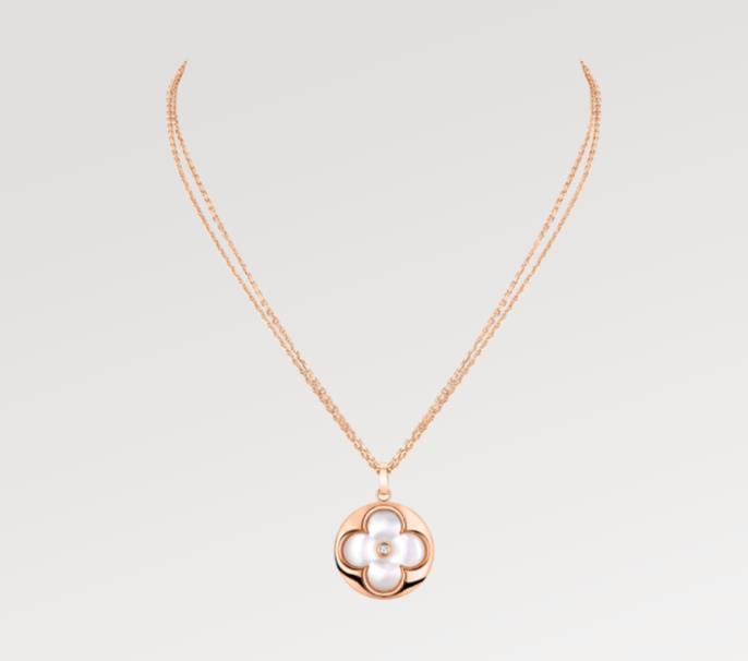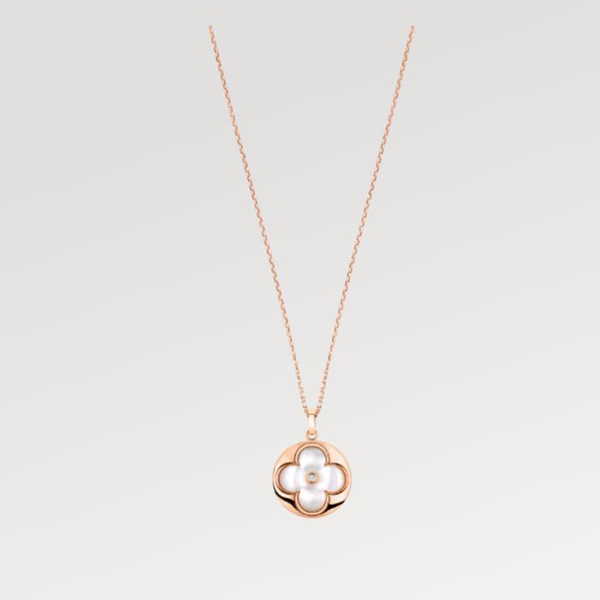 Color Blossom celebrates the Monogram flowers, created in 1896 by Georges-Louis Vuitton. Set into pink gold, the flower blooms into a carved white mother-of-pearl. The medallion has a new daring and bold size, complementary to the other Color Blossom models. The 3 different ways to wear it will freshen and adapt to every look.