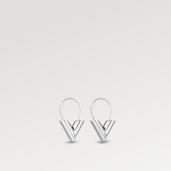A bright palladium finish gives the Essential V jewelry line a modern look signed discretely. Louis Vuitton’s graphic V motif is a striking feature of these hoop earrings.