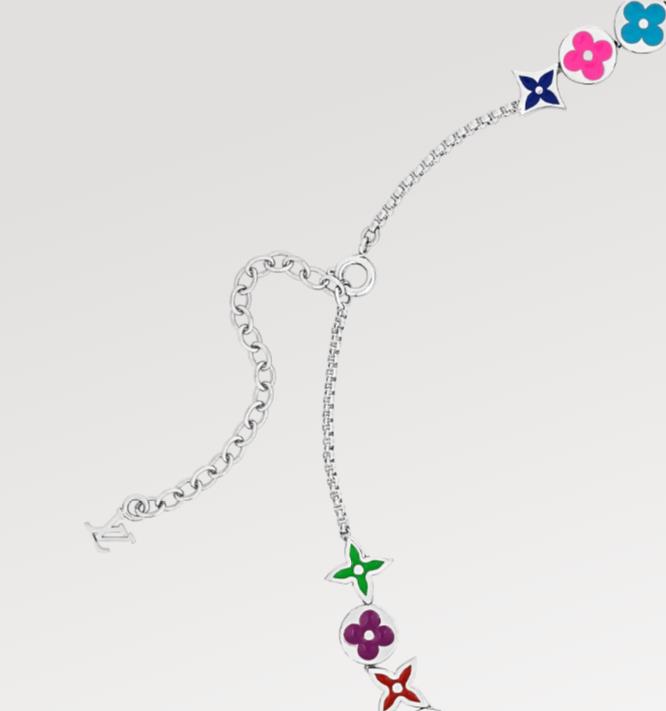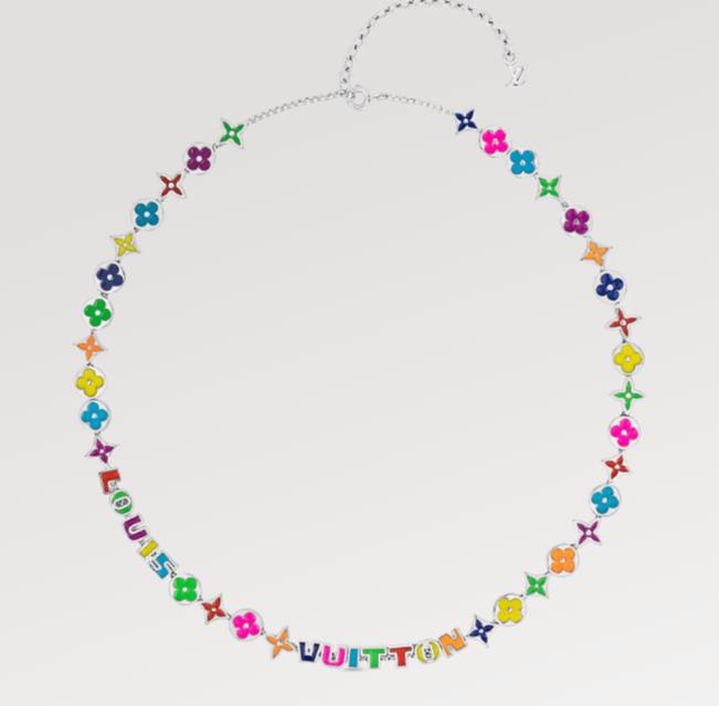 The Monogram Party Necklace, with its cheerful rainbow of beads, sets a festive tone for Spring-Summer 2022. It features Monogram Flowers and letter charms that spell out the House name, each one embedded with hand-set strass. This eye-catching piece and its companion bracelet and earrings are crafted in Italy.
