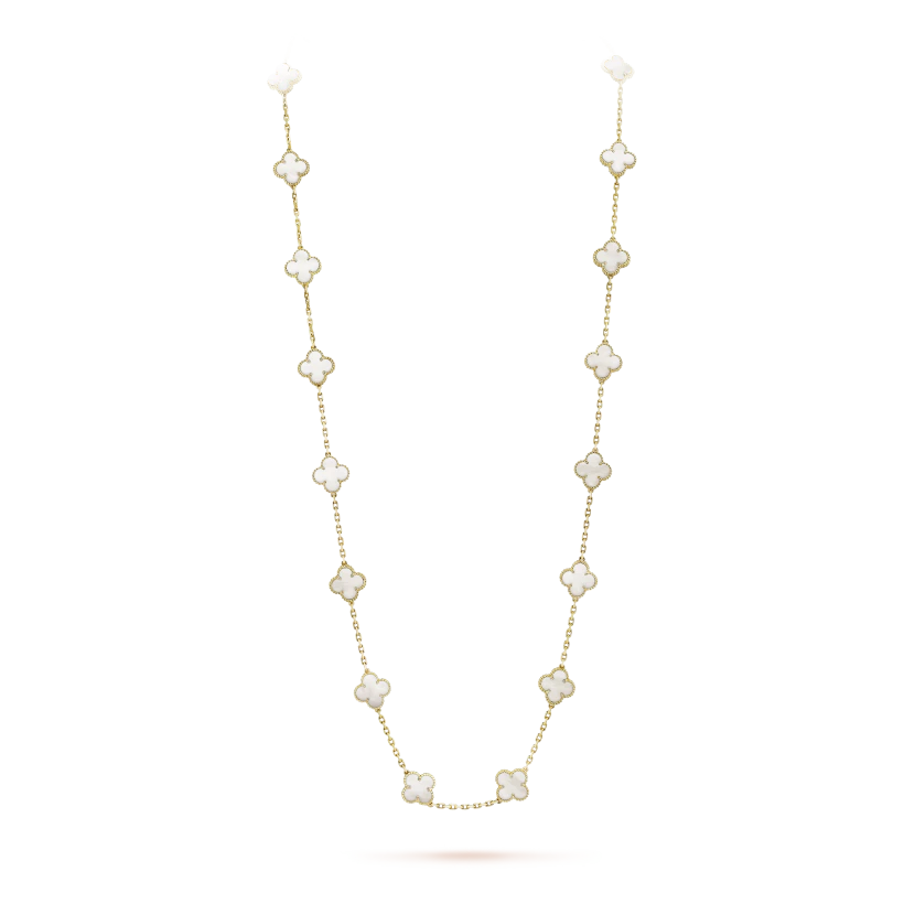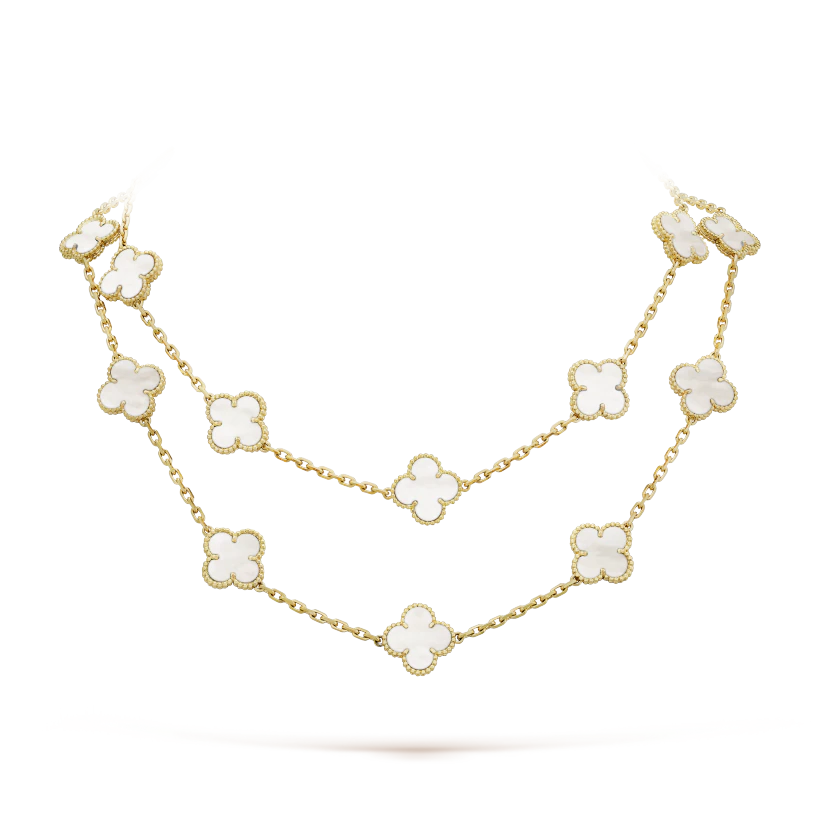 Vintage Alhambra long necklace, 20 pendants, 18K yellow gold, white mother-of-pearl.