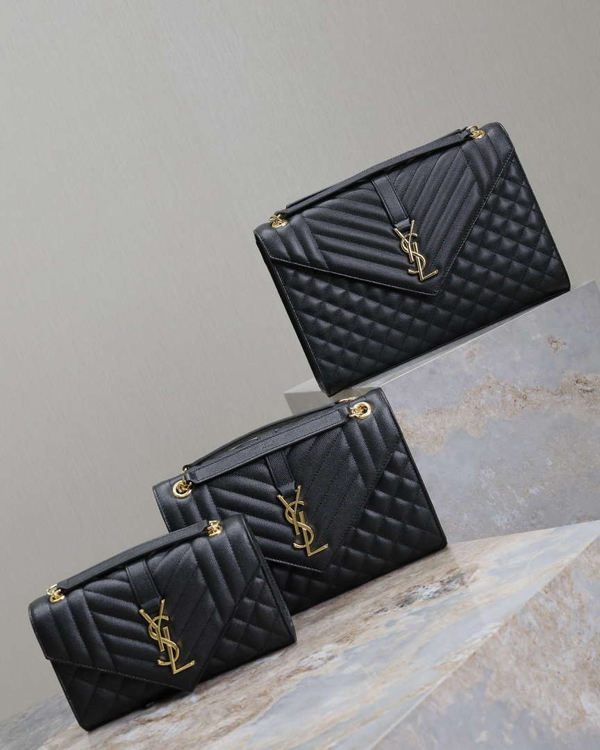 • YSL 600185 Envelope Meduim In Quilted Grain De Poudre Embossed Leather Black Gold