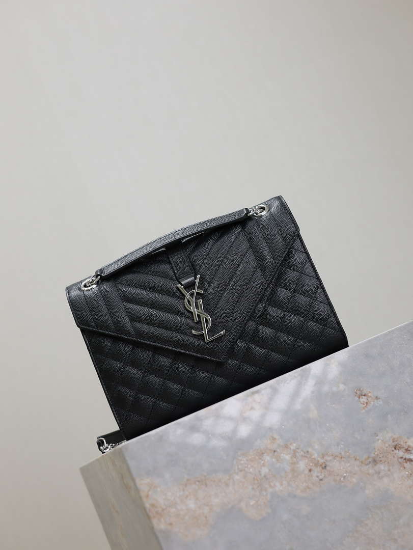 • YSL 600185 Envelope Meduim In Quilted Grain De Poudre Embossed Leather Black Silver