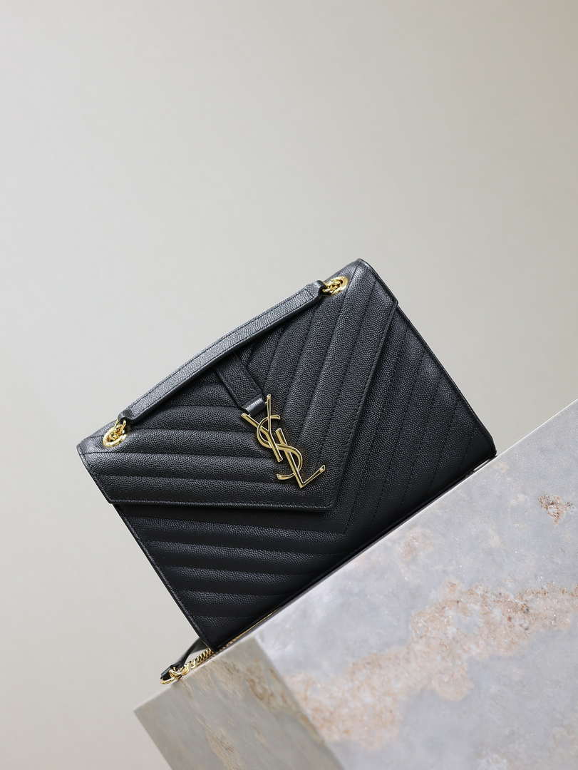 • YSL 600185 Envelope Meduim In Quilted Grain De Poudre Embossed Leather V Gird Black