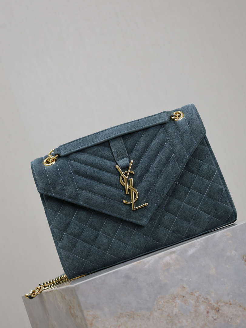 YSL 600195 Envelope Small In Quilted Dark Green Suede Leather